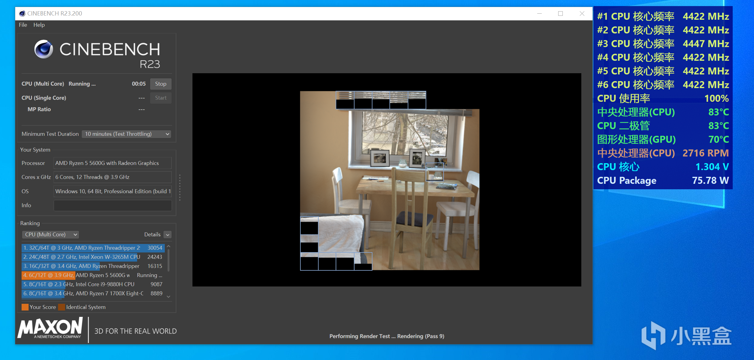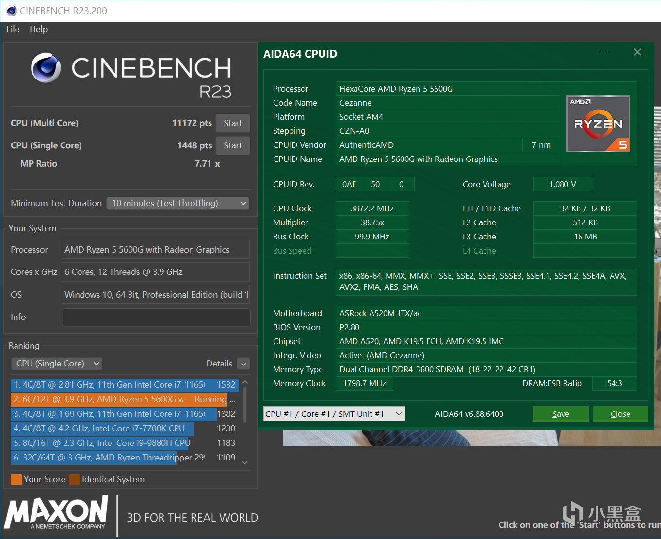 10分钟CINBENCH R23循环多核+单核一轮跑分,5600G多核为11172 pts,单核为1448 pts,正常性能水平发挥,多核性能其实和5600X相比差距很小,主要还是单核方面落后一些。