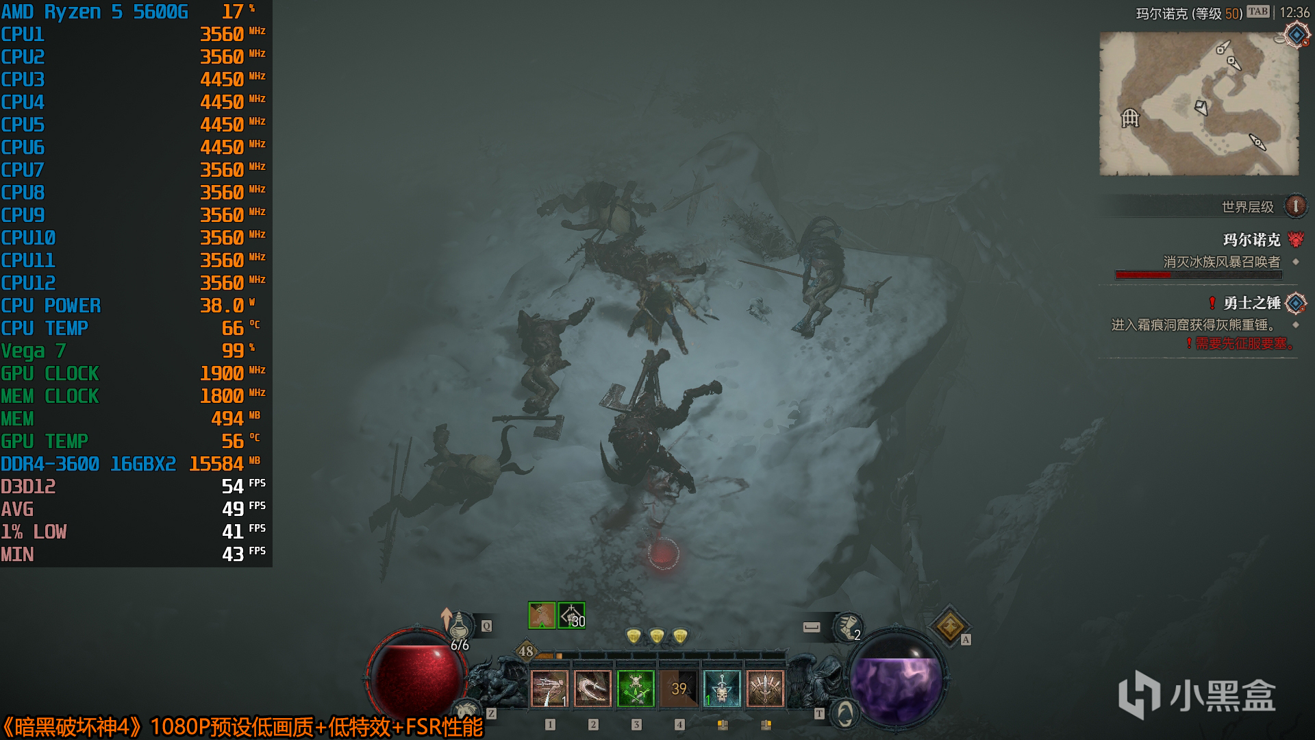 游戏只是简单跑了《暗黑破坏神4》,在1080P预设低画质+低特效+FSR性能情况下,在刷怪时能跑到平均49fps,能满足简单网游需求,《CS:GO》和《英雄联盟》就更加不需要测,就能知道大概表现了。