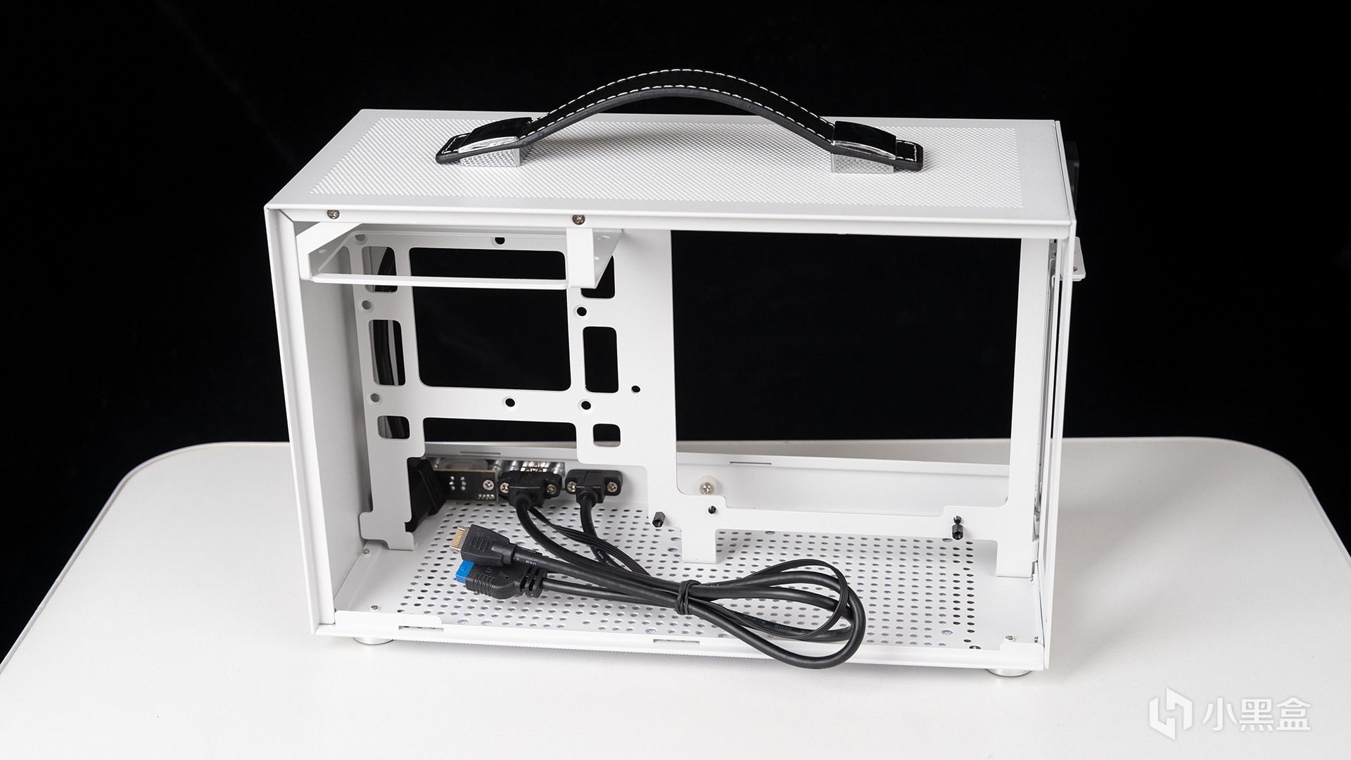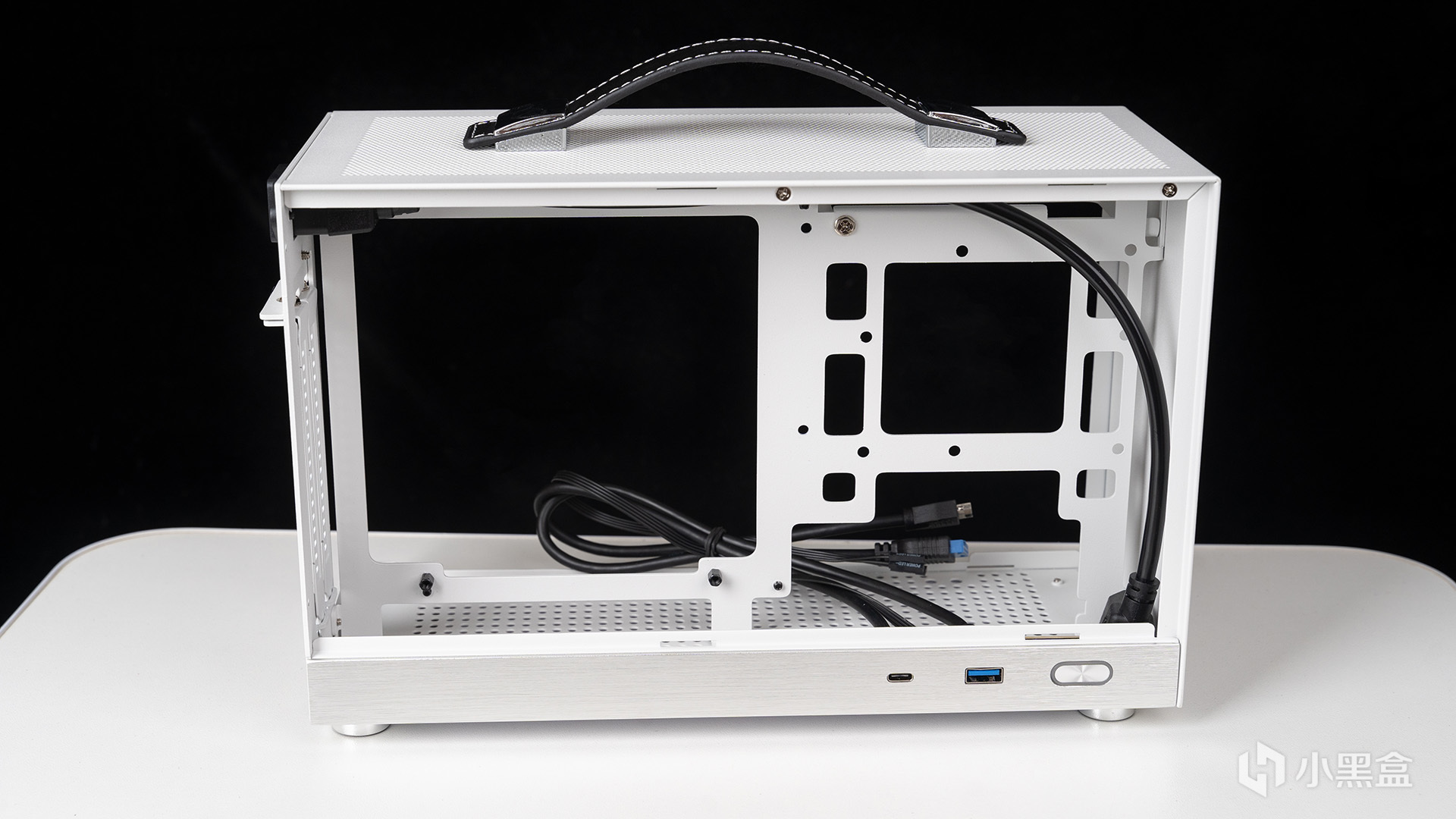 闪鳞S300顶部是有便携提手设计,配合便携屏,老爸出外估计也会带上它确实方便。提手强度方面,可以看到机箱内部采用两颗螺丝锁死,受力区域分散到整个托盘结构,看起来还是挺稳固的。