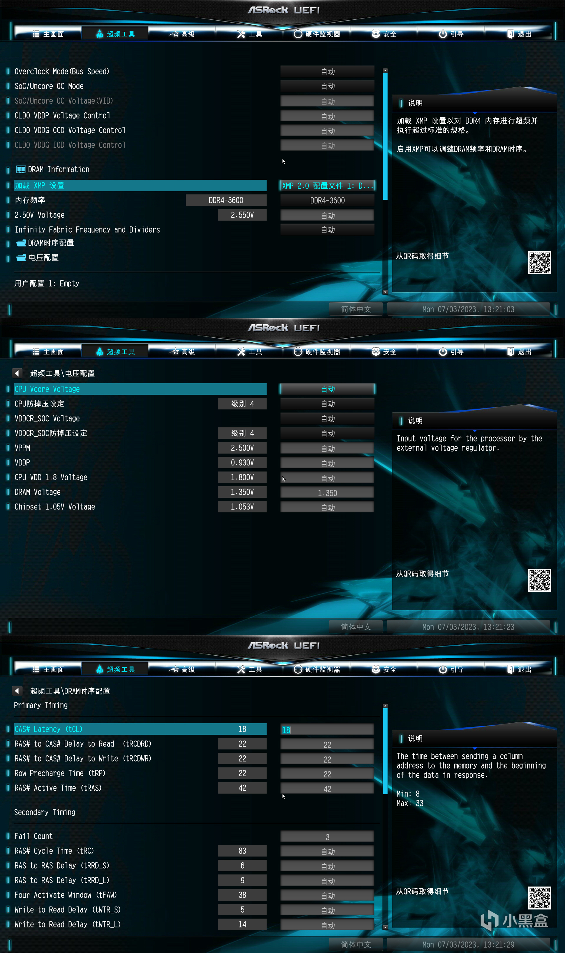 内存支持XMP 2.0技术,开启后达成DDR3 3600C18-22-22-42 & 1.35V,时序属于大众参数,硬核打算先直接XMP一段时间,后续再看能不能超到4000频率或者优化下时序。