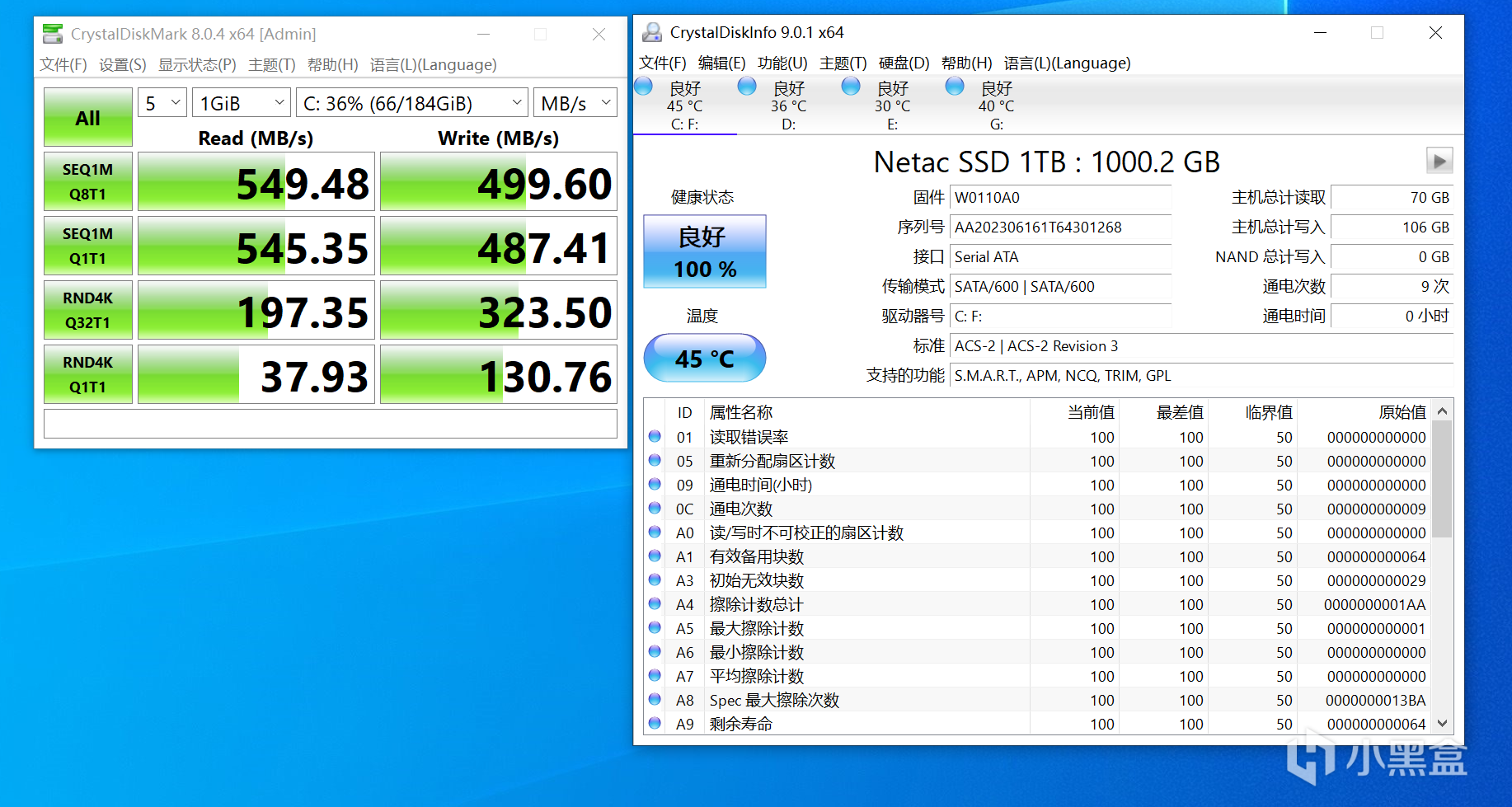 CrystalDiskMark峰值性能测试,朗科N550S 1TB顺序读取速度为549.48 MB/s,顺序写入速度为499.60 MB/s,和官方标称基本相符,就是末代SATA3.0固态的性能水平,作为系统盘已经满足需求,跑分时最高温度为45℃,表现良好。
