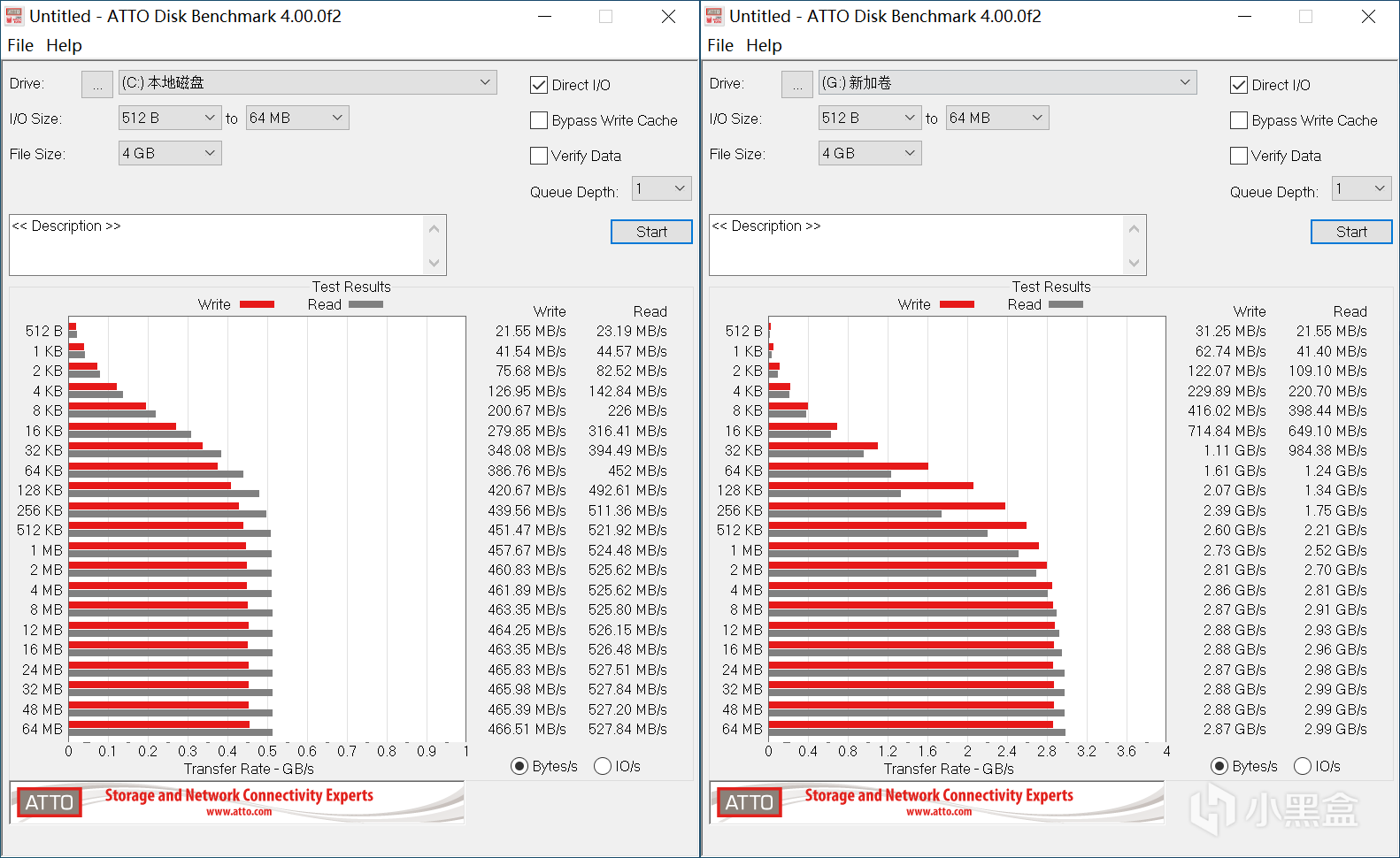 ATTO Disk Benchmarks QD1项目,设定大小是4GB,在0.5KB和1KB区间两个SSD性能差距并不大,在2KB之后开始拉开逐渐拉大性能差距,两者一致的是,在128KB区间之后,基本都能达到自身最大性能速率了。