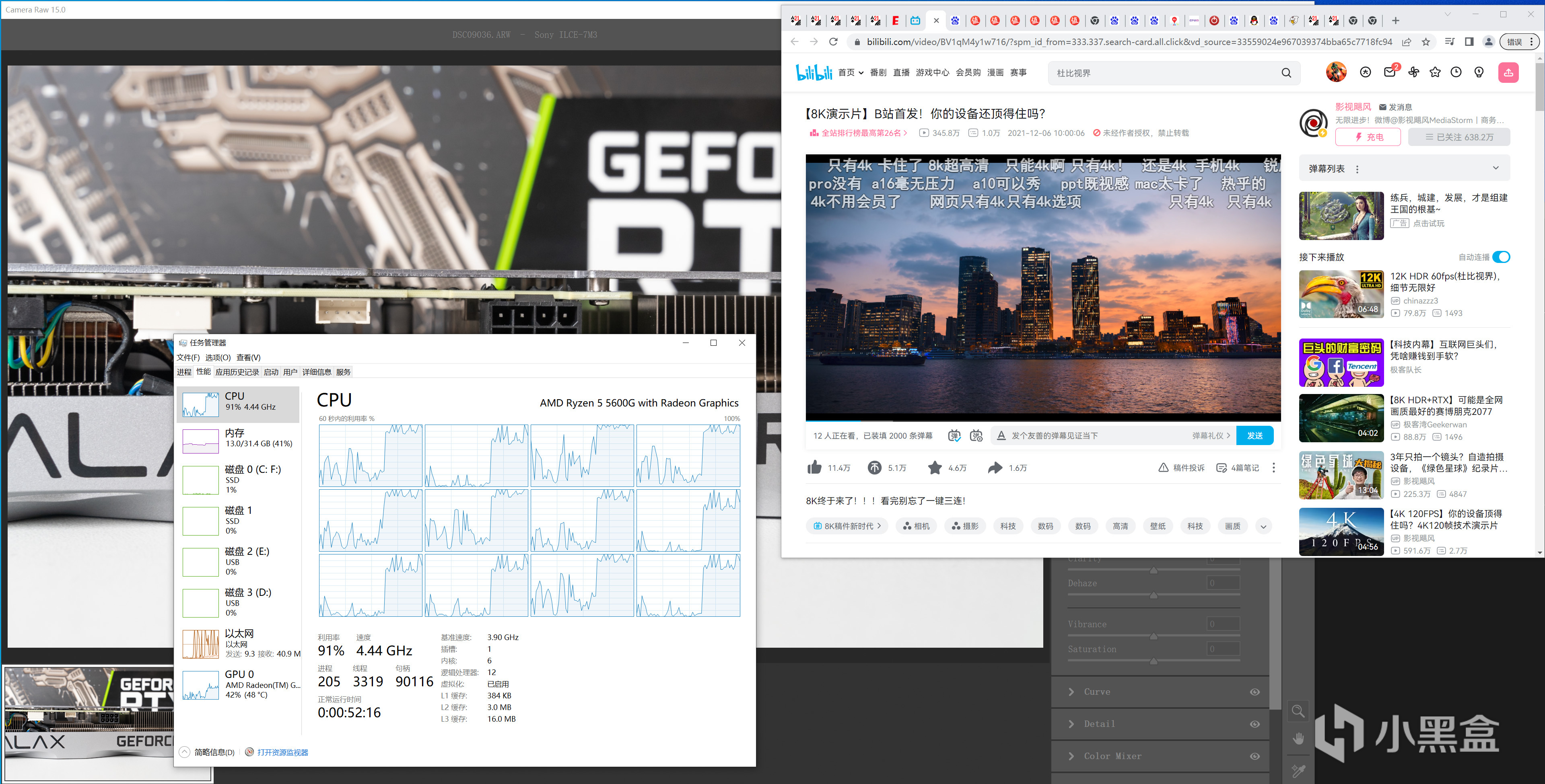 最后是多线程相关测试,按照老爸疯狂开网页的习惯,这里打开30个网页(其中有一个播放8K在线视频,另外一个是在线直播),再打开PS Camera RAW进行修图,这台5600G主机CPU已经吃到90%以上占用率,32GB内存吃了13GB,所以硬核一开始才没有考虑Core i3这种四核处理器,对于大部分日常场景来说,单核再强也不如多线程性能实在,16GB内存在现今也并非充裕了,当然这和个人使用习惯也有很大关系。