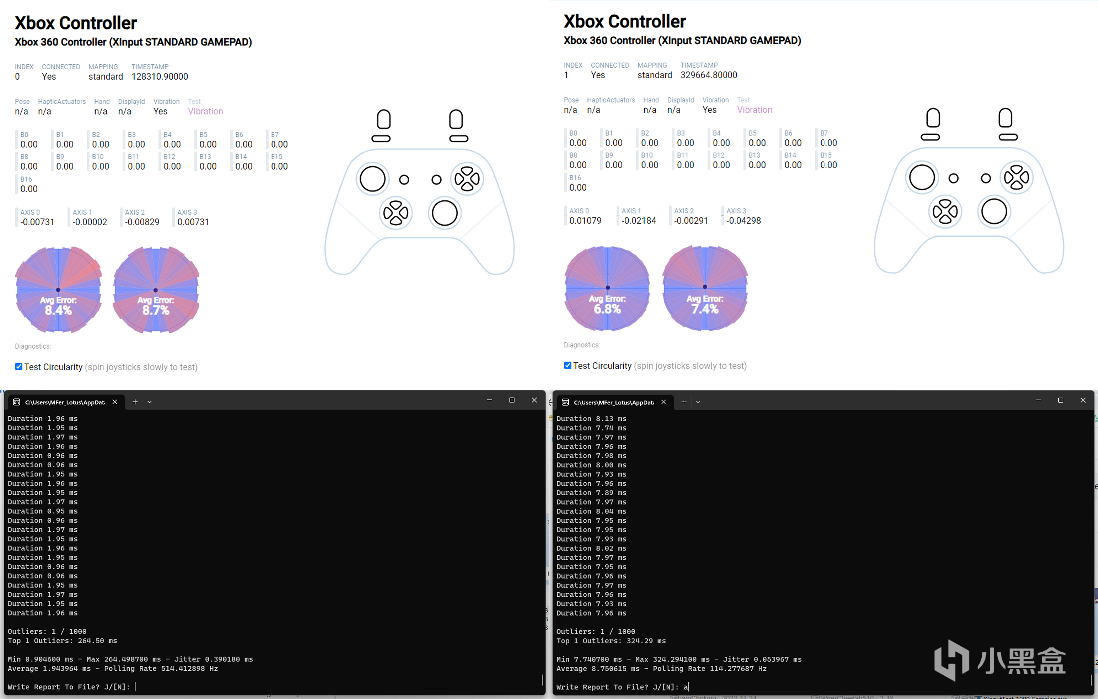 至於其他參數,姑且測試了一下:黑武士3 PRO的2.4G接收器和插線模式均能達到500Hz以上回報率,藍牙模式則是80Hz左右(畢竟是藍牙嘛)。搖桿測試,默認0死區,左右搖桿平均誤差8%左右,整體覆蓋偏方形。也順便測試了一下XSX的數據:使用官方接收器情況下,平均誤差7%左右,整體覆蓋比黑武士更圓一點,但回報率只有120Hz左右,藍牙模式不想測。