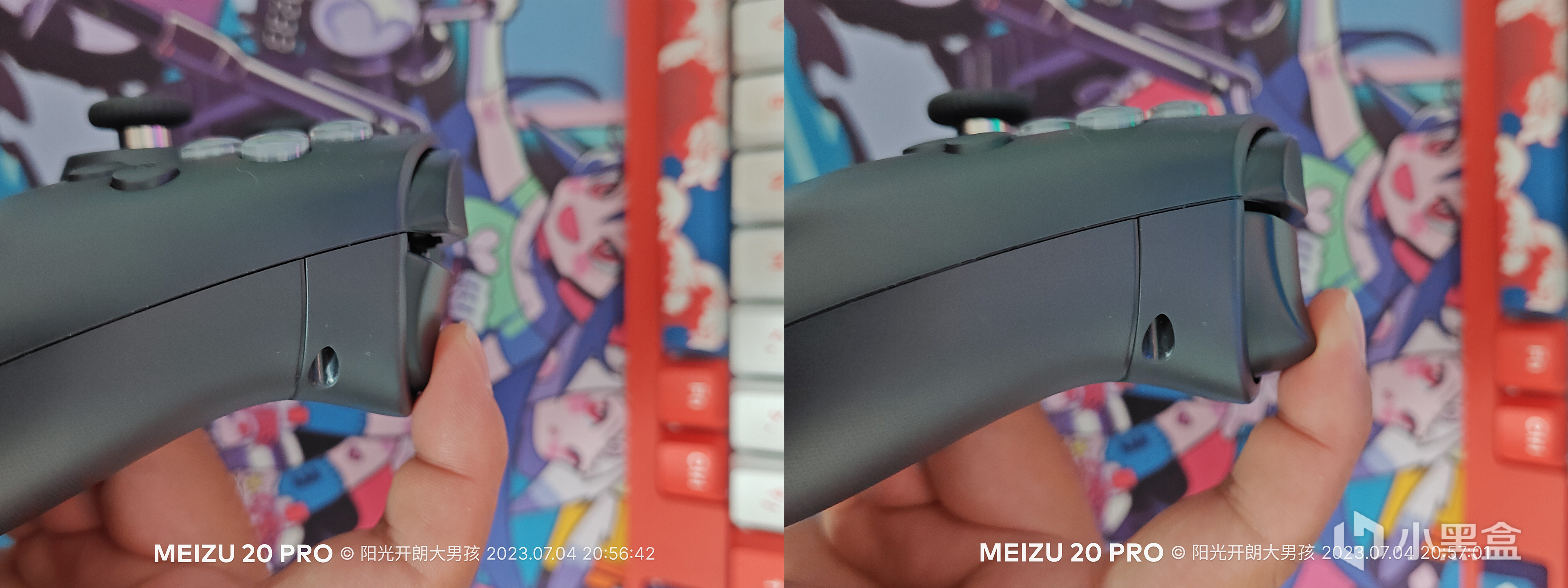 分段扳機也一直是我想要的一個功能。因爲之前打怪獵曙光時,作爲太刀俠,按納刀(RT+Y)總會莫名其妙觸發成氣刃斬(RT)。在怪獵世界裏雖然也偶現這種情況,但曙光裏尤爲突出,貌似是因爲曙光的指令讀取有所更改?總之,這就讓我非常想要一個短行程扳機,最好直接微動,減少誤觸概率。黑武士3的扳機恰分微動和線性兩種模式。微動的手感與ABXY類似,但更偏硬一點;線性與XSX的扳機手感有所差別,按壓力度、回彈力度比XSX稍輕,個人感覺還不錯,雖說按壓質感上沒有XSX那麼優秀,但更省力一些,而且黑武士3 PRO也有着扳機震動這一絕活。順便說肩鍵,XSX的肩鍵是乾脆“鏗鏘”的,黑武士3則是稍顯柔和,質感上XSX更多“塑料”般的脆、硬,黑武士3多了一絲淳厚,都觸發分明,不過個人更喜歡黑武士3一點。