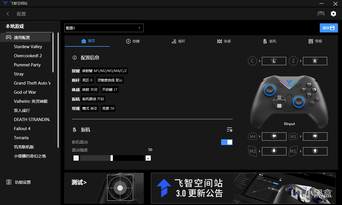 第三方手柄一般都會有一個自己品牌專屬的手柄DIY調教軟件,飛智當然也不例外——飛智空間站3.0。不過說實話,作爲一直默認使用XSX的“中古傳統”玩家,還真是第一次接觸這種“新潮”玩意。第一次打開空間站就提示更新手柄固件,修復了一些bug,看來飛智的後續維護還是挺不錯的。作爲黑武士3系列的“伴生”軟件,空間站3.0的可自定義性是相當豐富的,對於我這種第一次接觸的玩家更稱得上眼花繚亂:扳機行程、震動開關、強度,搖桿死區、靈敏度曲線,體感映射、靈敏度、全鍵位映射等。豐富的可自定義選項,相信摸索一段時間後,我可以把黑武士3 PRO完全“調教”成我的形狀了。而目前我唯一看得懂的就是燈光自定義,不過可惜只有燈光模式、頻率、亮度選擇,並不能自定顏色,希望後期能有這個功能,讓我完成桌面紫色大一統(機箱、鼠標、顯示器增高架都是紫光)。