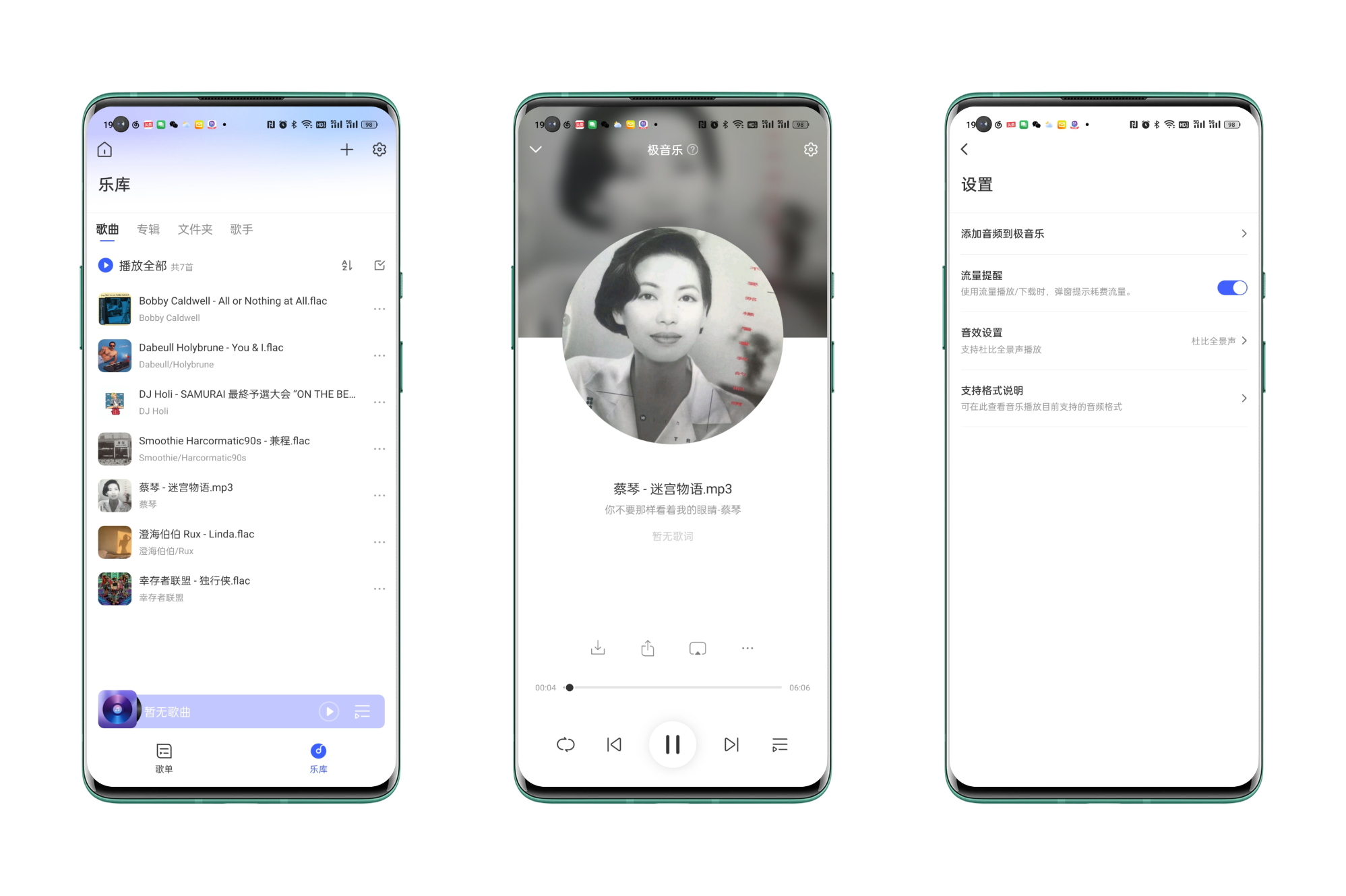 上傳了MP3和FLAC格式作爲測試樣本,實測都可以流暢播放,但是不支持EQ調整,所以聽起來原汁原味,如果你的播放設備支持杜比全景聲,還可以在設置中開啓,效果拔羣。