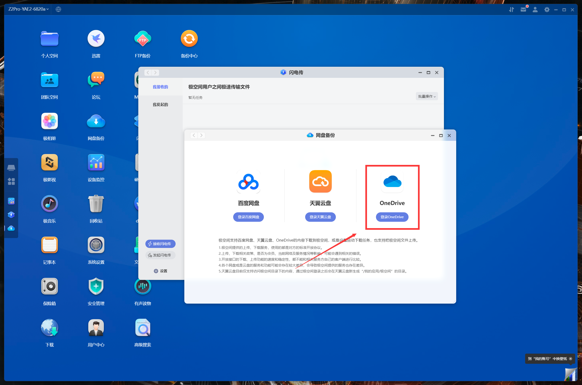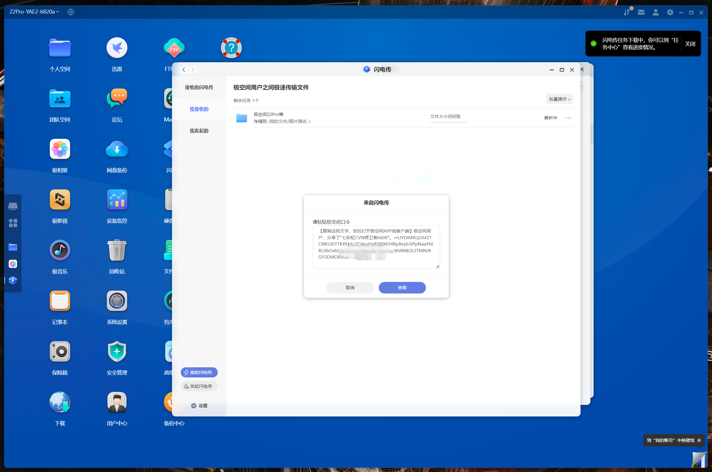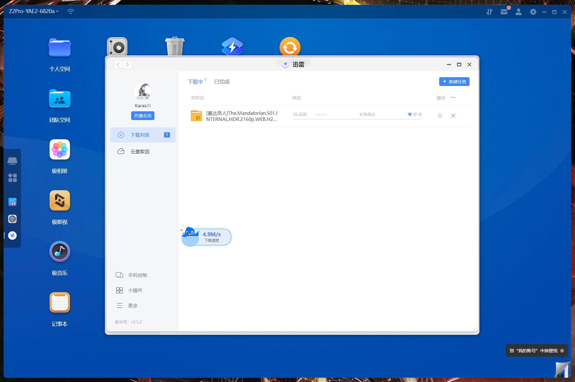 遠程下載(迅雷),大部分的NAS其實都和迅雷做了合作,不過很少給ARM機型做適配,極空間Z2Pro做了單獨的優化,比如下圖中顯示當前下載速度的懸浮窗。
