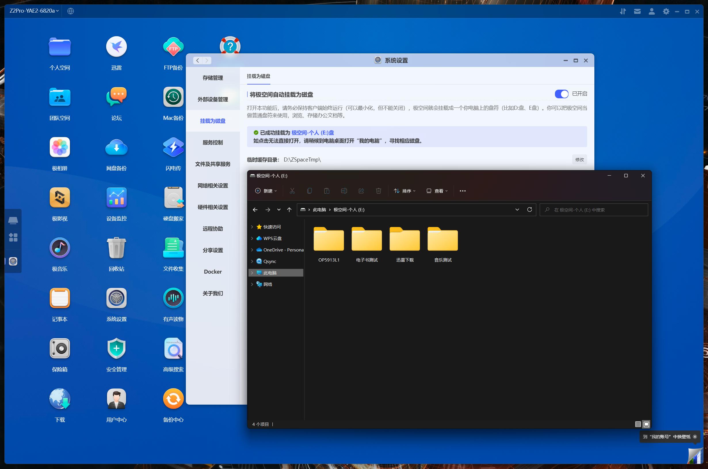 另外極空間也有簡化版本的掛載功能,說簡單點就是將極空間當成電腦的本地硬盤用,對網絡知識比較薄弱的用戶來說很方便,不過讀寫速度是跟着網絡帶寬走。