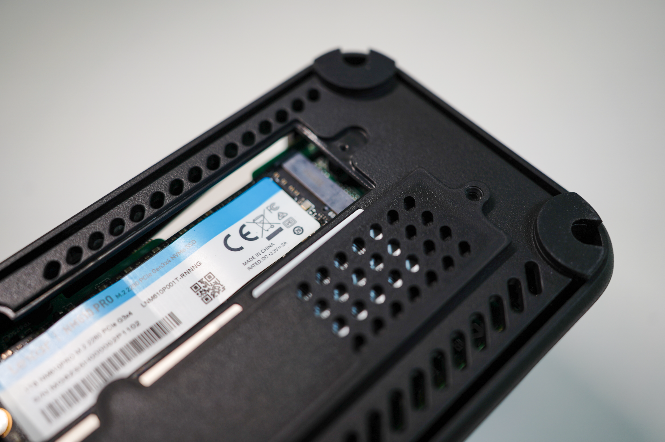 固態硬盤則是被設計在底座的底部,拆卸掉擋板的固定螺絲即可安裝2280長度的固態硬盤,也就是常規長度的都可以上,不過個人建議按需安裝固態硬盤,一般用不到。