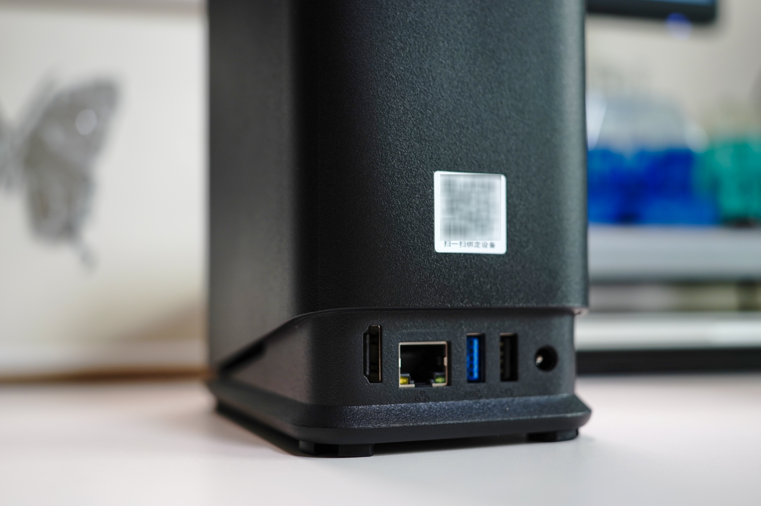 外部接口都在機身背部的下半部分,2.5G網口自帶狀態顯示燈,USB接口可以通過顏色區分,其中藍色爲USB3.2Gen1接口,黑色的則是USB2.0。