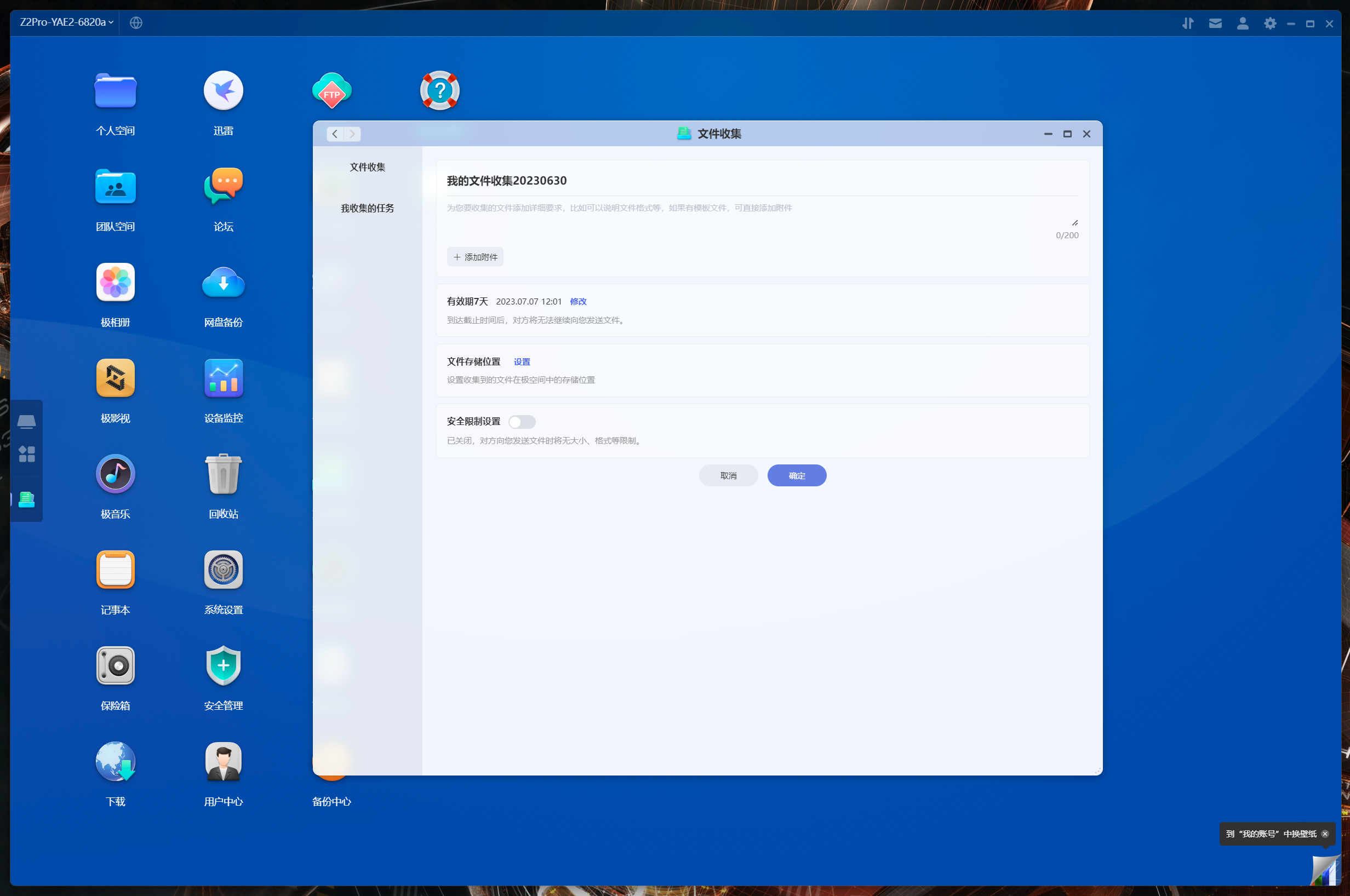 極空間針對協同辦公還單獨設計了文檔收集功能,可以快速創建一個收集任務,其他用戶在收到鏈接後按照提示上傳即可,雖然不是什麼複雜功能,但很實用。