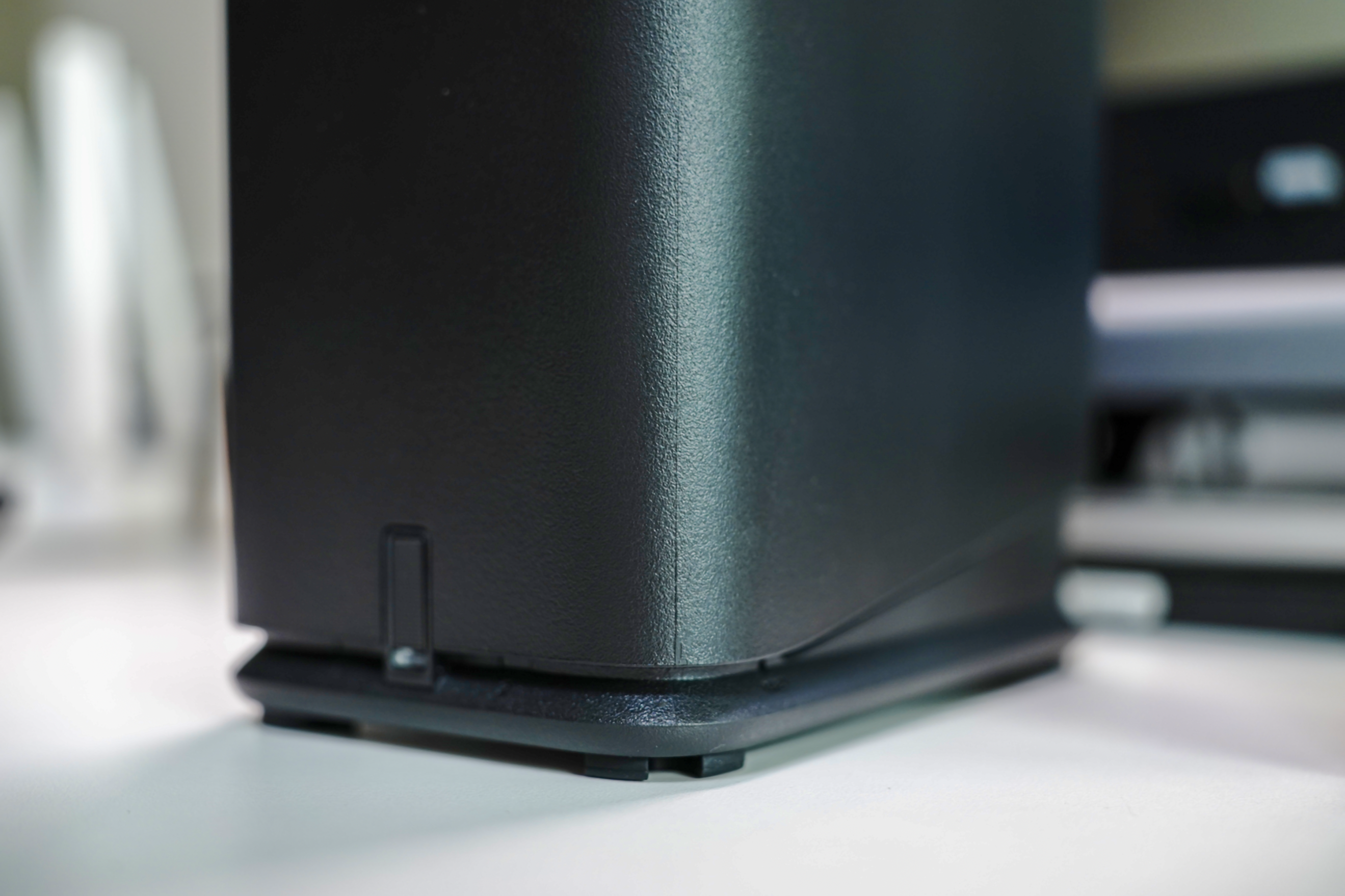 先簡單過一遍造型,極空間Z2Pro的尺寸爲217*146.5mm887.5mm,高度比聽裝可樂略高一些,寬度比3.5寸硬盤略寬一些,材質則是主打堅固輕便的ABS,表面做了防滑的磨砂處理。