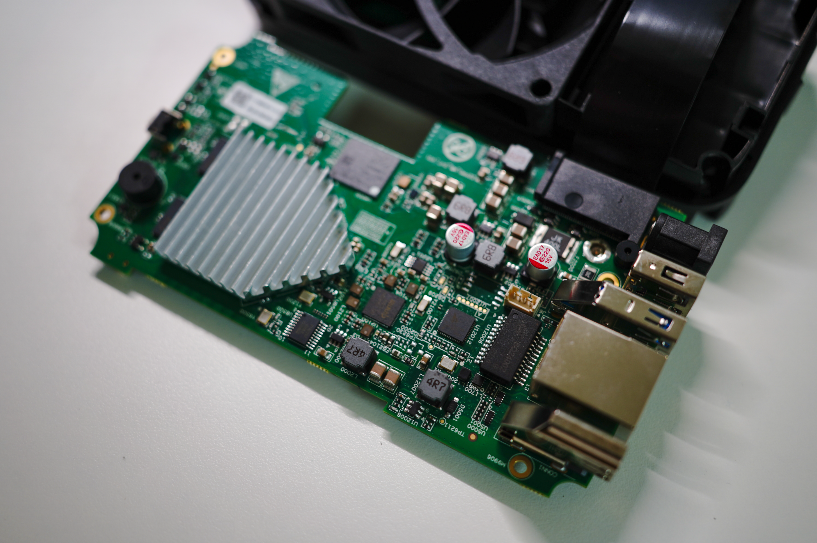 卸掉底座周邊一圈的固定螺絲之後即可掀開連着風扇的底座上蓋,主板就藏在底座中間,看着比較緊湊,麻雀雖小但五臟俱全。
