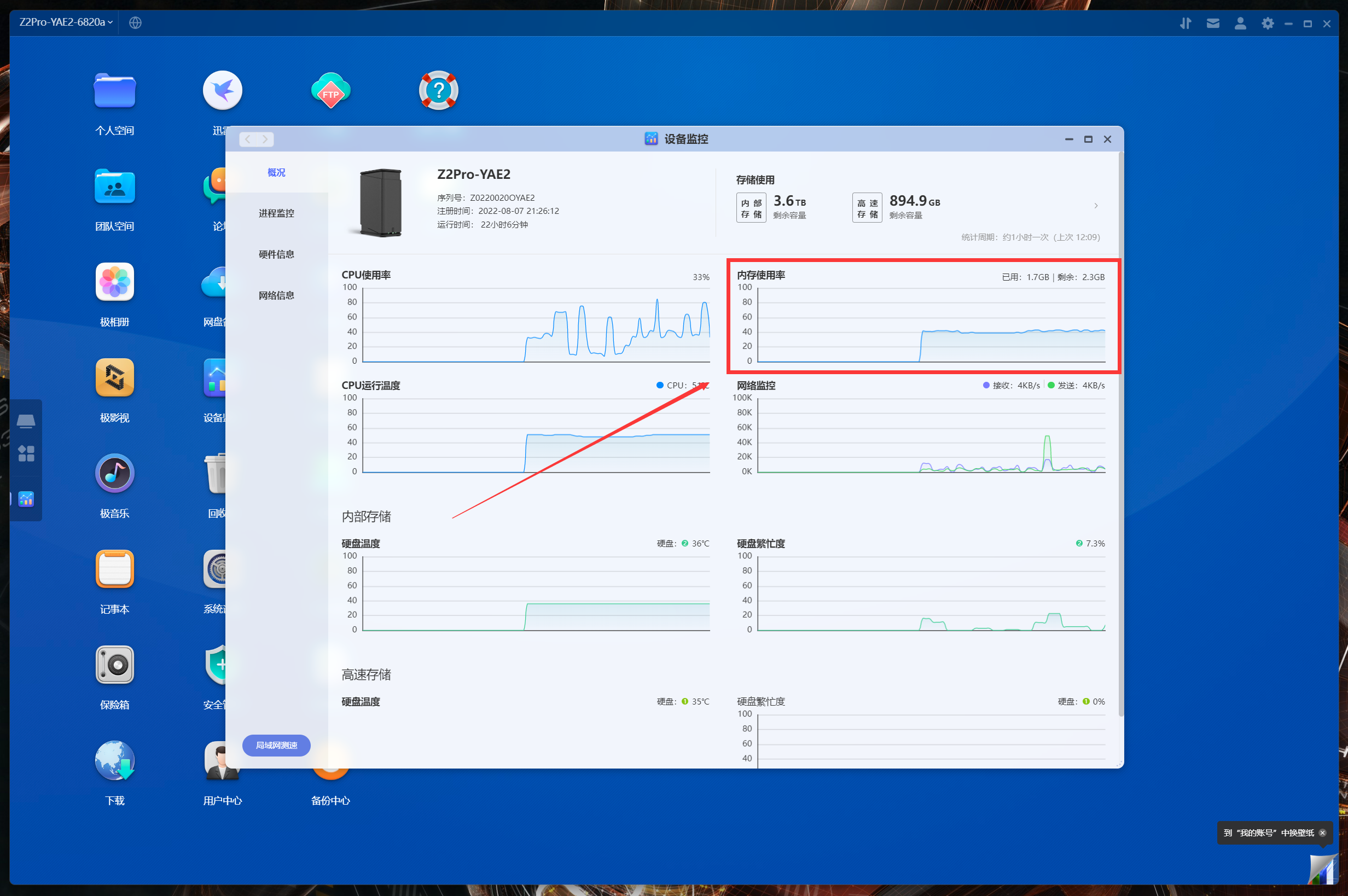 極空間Z2Pro只有4G內存,並且沒有SO-DIMM可以直接拔插擴容,所以需要合理分配使用。