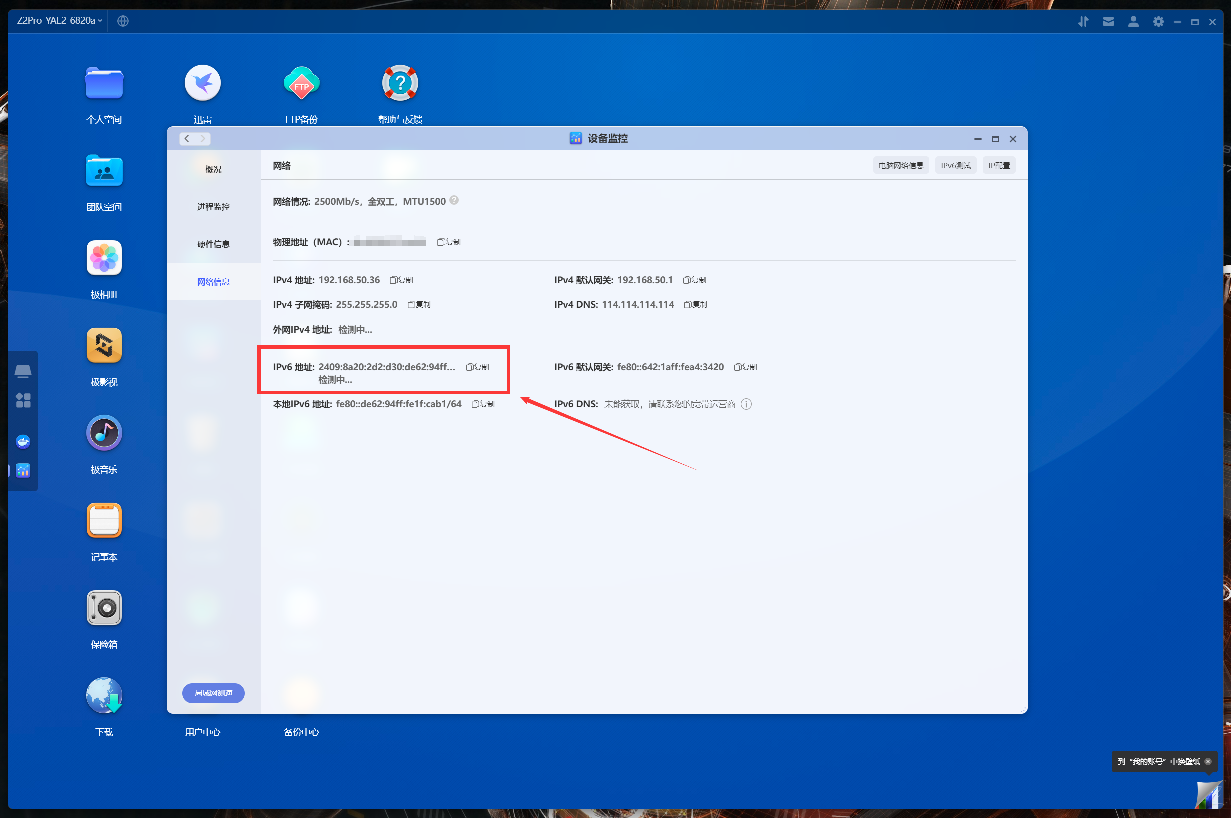 在極空間的客戶端找到設備監控,進入網絡信息頁面,圈出來的地方就是極空間獲取到的IPv6協議的IP,非fe開頭都是公網,點擊複製。