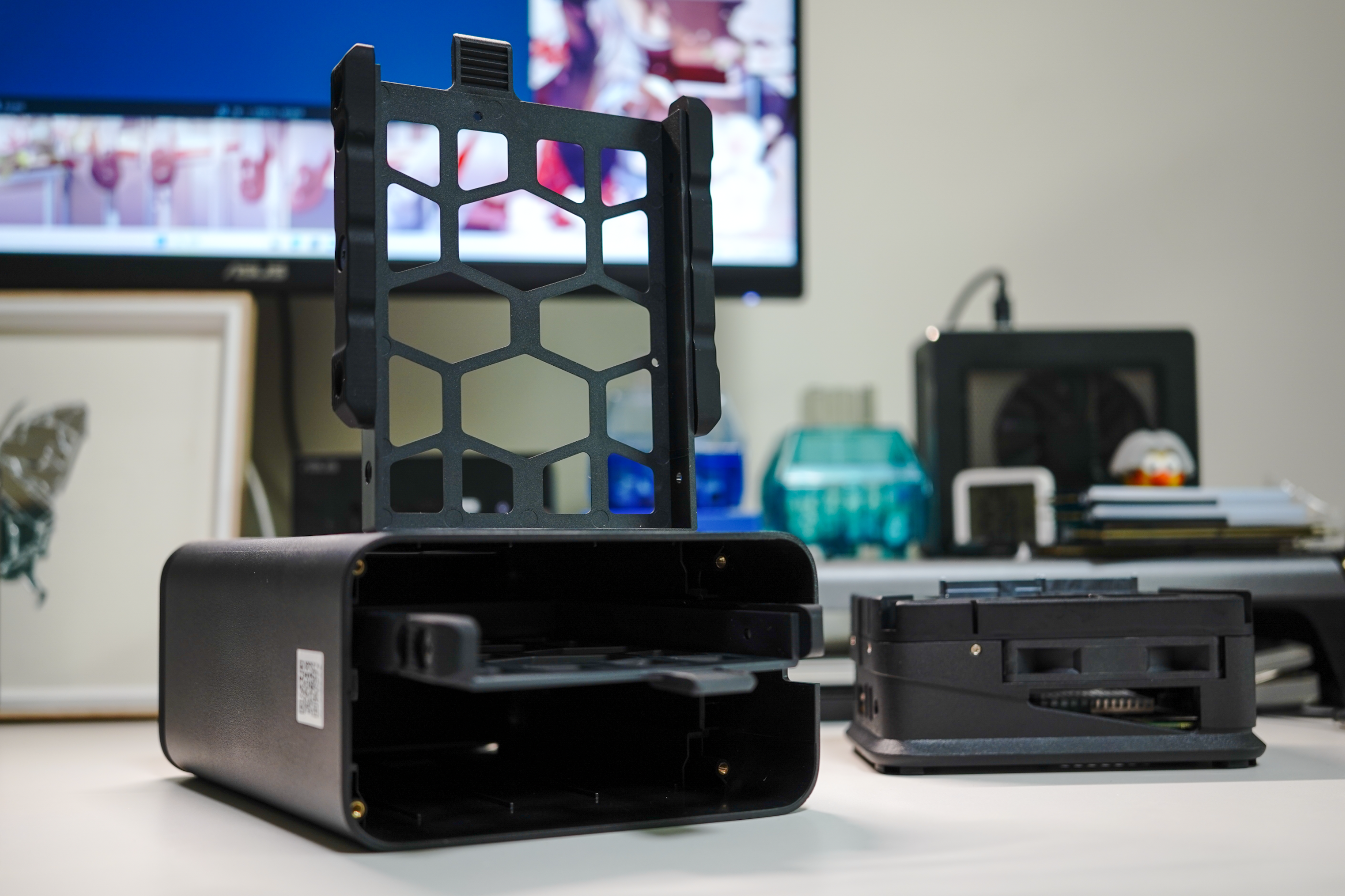 硬盤籠的設計比較奇怪,採用的是半截籃設計,兩側有非常厚的硅膠條,可以起到很好的固定+緩震作用,硬盤是全軟鏈接,固定硬盤不需要螺絲,可以進一步減振和降低噪音。