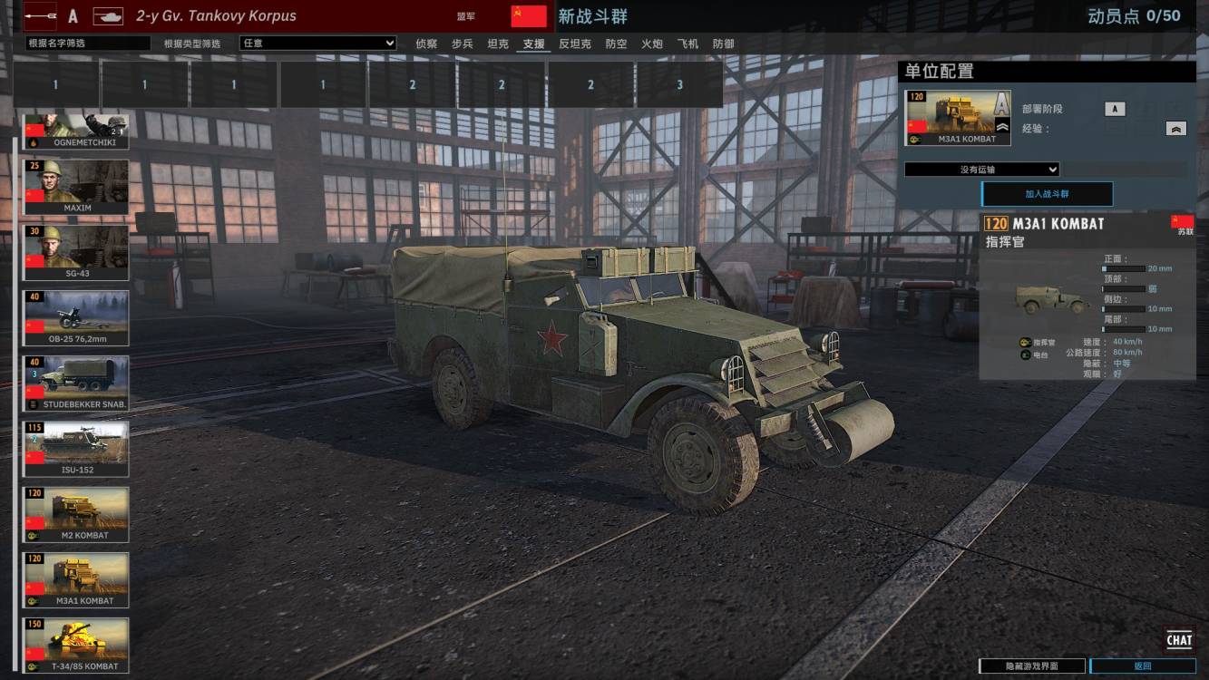 另一个特点是SD2取消了传统的基地发育过程,乐于前期苟发育后期平推的玩家会许些失望(其实在高级AI面前,就算堆10辆重坦,一门重型ATG能给你干掉一半),主打的就是一个战斗体验。游戏分为ABC等阶段,每个阶段一定时间提供固定征召点,用以部署后续部队。而游戏的卡组系统(玩家上场的单位需要组卡,每在卡组中加入一个单要耗费动员点)使玩家各个阶段部署的单位不同,A阶段侦查和占据有利地形,BC阶段则是玩家独特卡组的表演阶段,钢铁洪流带给对方战线巨大压力的装甲师,抑或步兵为主钻小树林和蹲墙角的“越共”师,还是主打的就是信仰的空军流,玩家可以随心所欲的组出自己理想的钢铁之师(新手可以使用默认的历史师配置,有一定理解后可尝试自己组卡)。