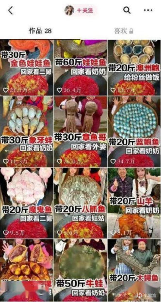 不只是大白鲨,在“提子”的主页中(现在已被封号)还有着一些像是食用30斤金色娃娃鱼的视频,以及鳄鱼、鳄龟、鸵鸟腿等等,简直就是“珍稀动物大杂烩”。