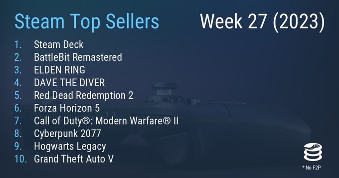 Steam平臺2023年6月27日-2023年7月4日銷量榜現已出爐,本次Steam Deck成功登頂,而取得上週榜一像素版戰地《BattleBit Remastered》這周掉到了第二名,而“到底誰在買5”仍然排在第10名。