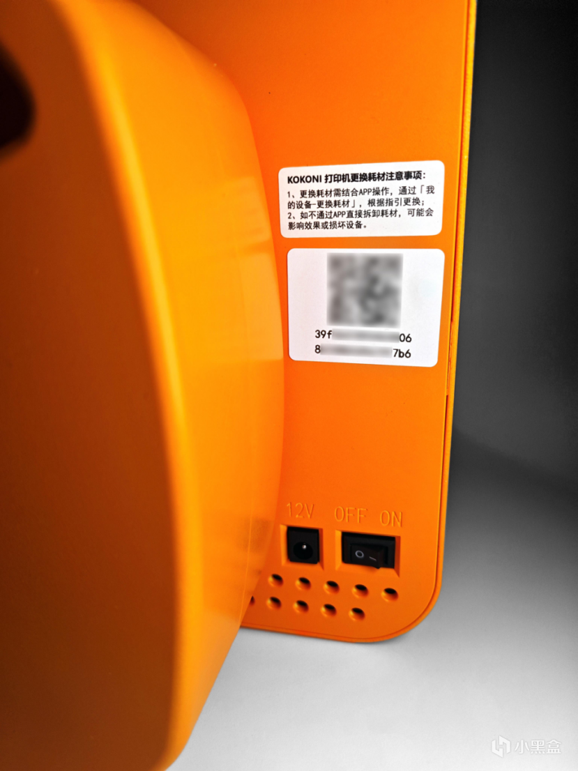 背面右下角则贴有注意事项和设备二维码,12V圆孔电源输入插口和机器开关在下方。