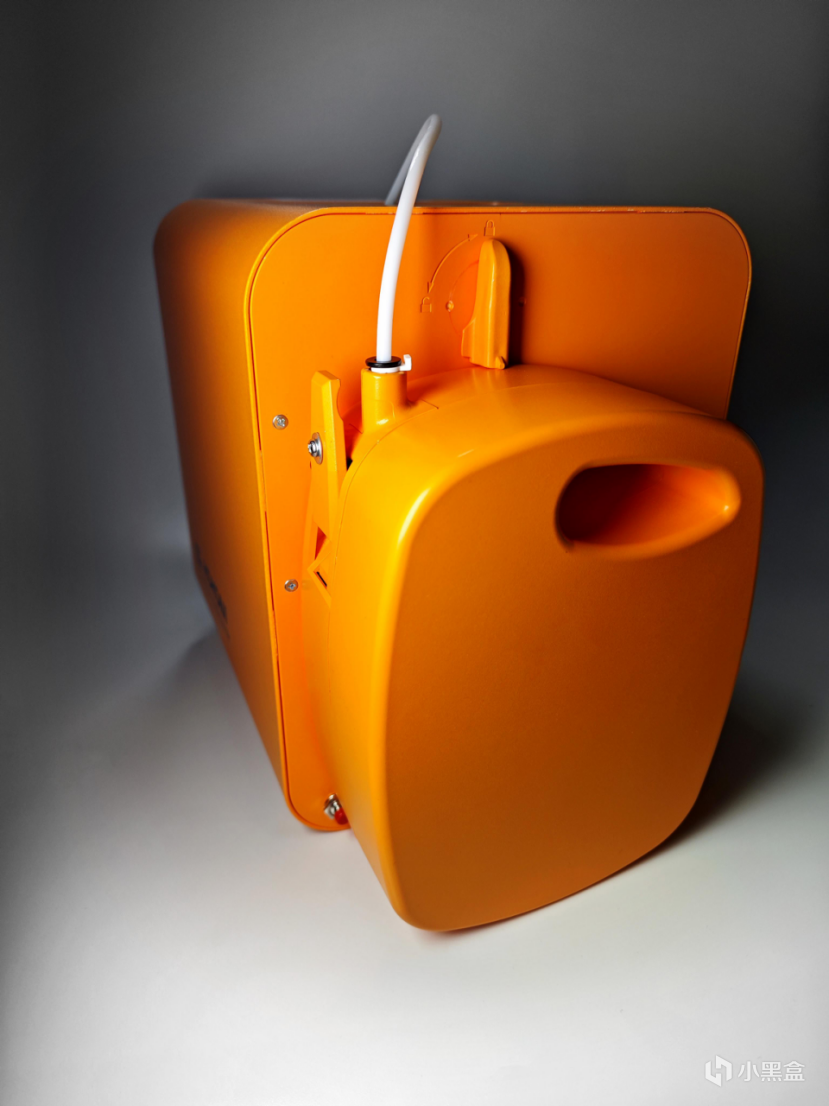 背面将耗材做成了一体模块化的“油箱”,从这里伸出一根导管,穿过顶部狭长的开口接到“舱内”。