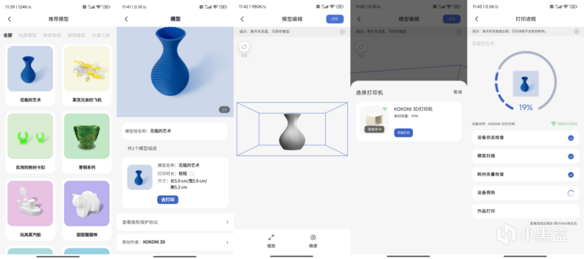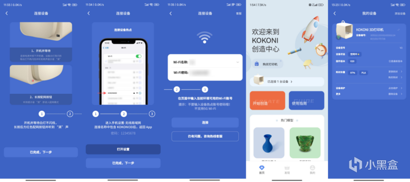 连上电源,开启开关,便可以用“KOKONI3D”手机App连接配网——是的,KOKONI EC2采用了跟很多AIoT产品一样的连接方式,一次配网便可使用,外出也可随时查看控制家中的3D打印进程。