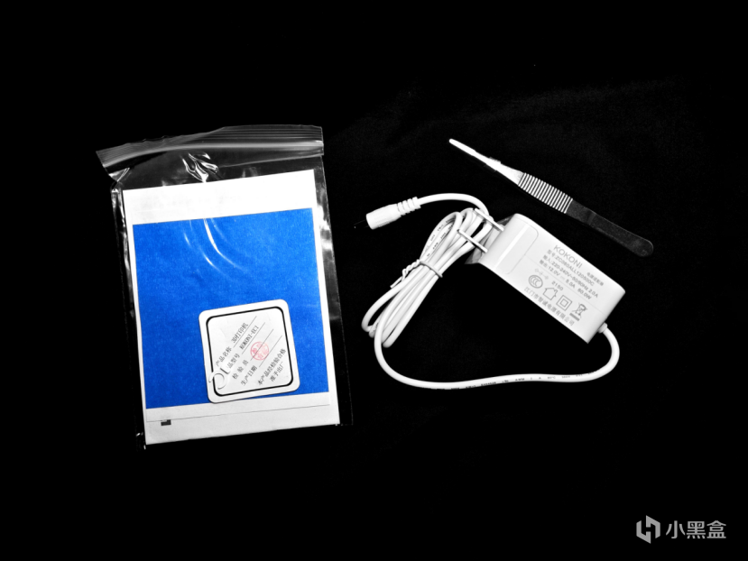 相应的配件有电源、镊子和装有说明书等材料和一个料盒导管的卡扣。
