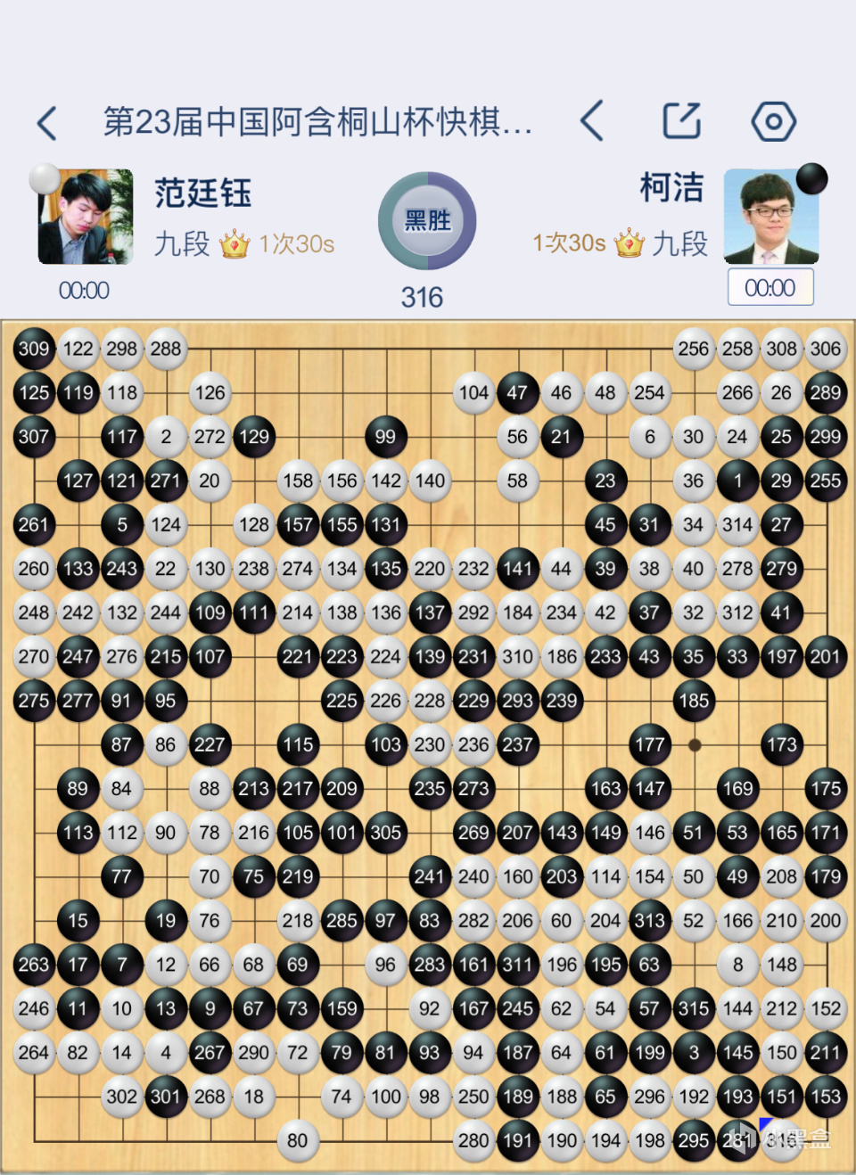 2016年,柯潔在第18屆阿含桐山杯中國圍棋快棋公開賽決賽中,執白2又1/4子戰勝陳耀燁,再次獲得阿含桐山杯冠軍!