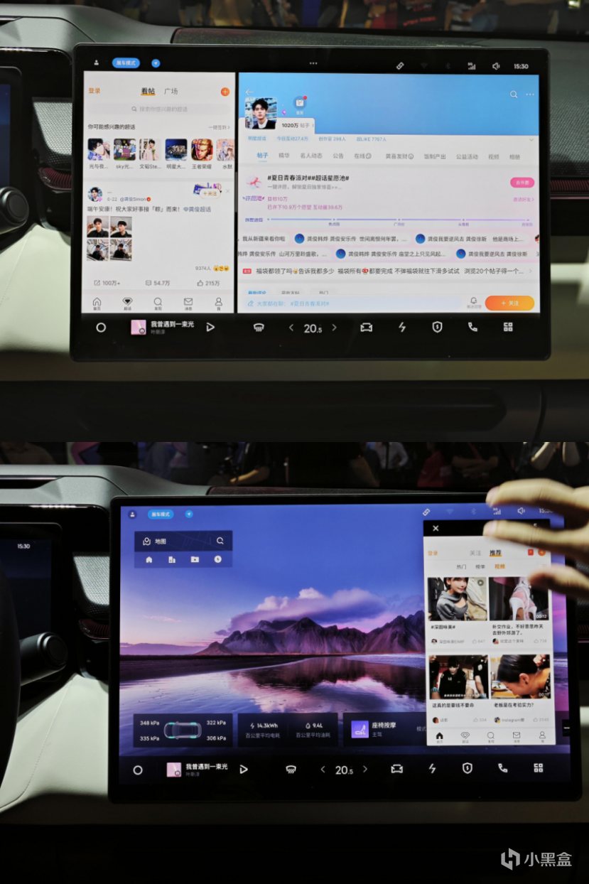 支持手机应用无缝流转至车载大屏,手机桌面直接以多屏幕同时呈现在车机上,类似很多折叠屏手机展开后的桌面排列。
