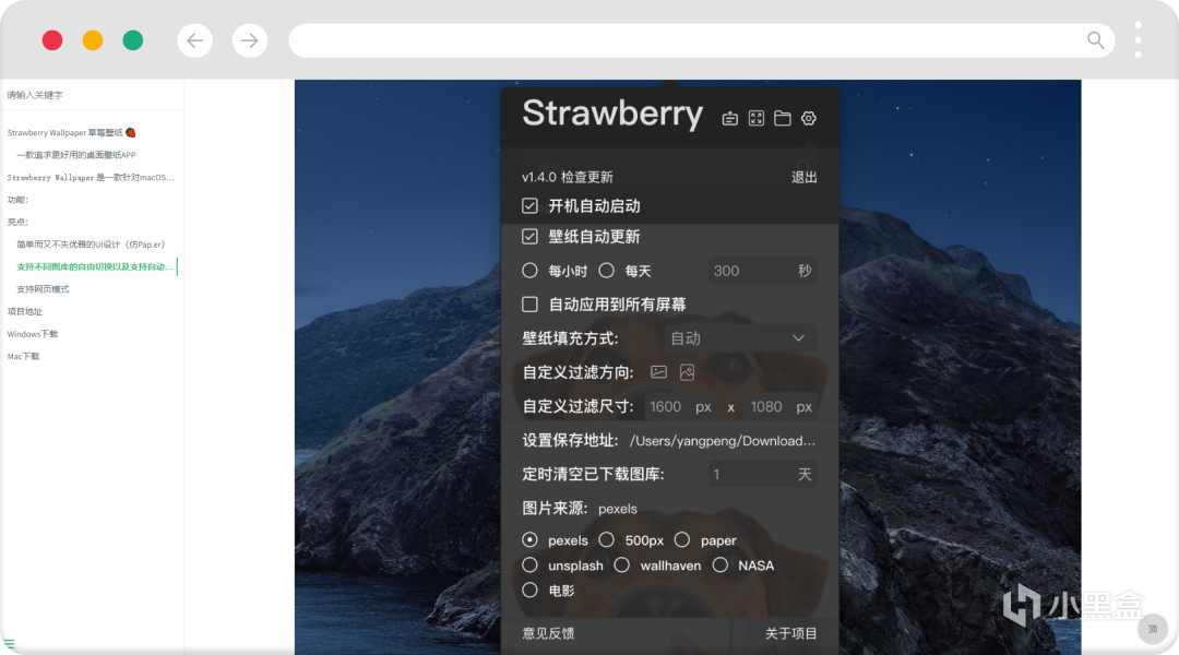 Splashy是一款用unsplash圖片作壁紙的軟件。Unsplash是一個非常有名的圖片下載網站,Splashy 能夠讓輕鬆地使用Unsplash上的圖片作爲壁紙。它提供了一個隨機按鈕,像點擊一下軟件便會從Unsplash下載一張高清圖片,並將其設置爲桌面壁紙。對於喜歡自動切換壁紙的人,也可以可以設置類別,比如風景、人物、精選等。