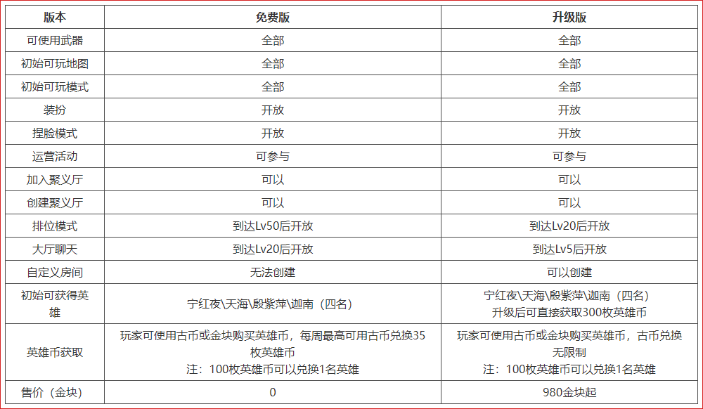 A:免费进入游戏的玩家将和买断版/升级版玩家拥有一致的局内战斗体验。捏脸、装扮与各种运营活动也将对免费玩家开启。