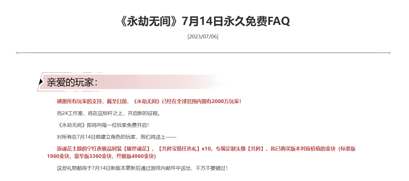 A:2023年7月14日5:00将进行停服更新维护,维护结束后进入游戏,即可免费开玩!买断版本售卖截止时间为7月13日23:59:59。