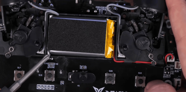 拆開手柄後,果然發現一分錢一分貨,跟飛智的冰原狼一對比,一邊穿着奢侈品一邊則是穿着地攤貨。居中的電池倉依舊是非常穩健,看大小電量也不會虛標;不漏焊,厚主板也是黑武士一貫的品質保證。