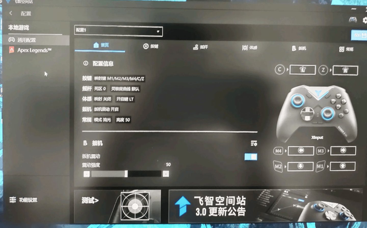 黑武士3pro跟常規手柄一樣配備了兩個握把馬達,還另外配備了兩個扳機馬達。出場設置下,兩種馬達的震動都比較霸道,可能是爲了讓玩家有更強的遊戲沉浸感。我們可以下載飛智空間站,在這款專門針對飛智手柄的專業app上進行震動強度,燈光,遙杆等等進行個性化調節。