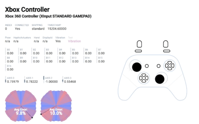 黑武士3pro遙杆中心出廠就是無死區,比起國內大部分手柄需要手動調節要方便很多。利用手柄網站測試,手柄遙杆外圈受力比較均勻,也只有10%的報錯率,是非常不錯的表現。中心點移動比較順滑,回中非常迅速,左右前後的虛位大概總結是2%左右,已經是同類型手柄遙杆算法調教天花板了。