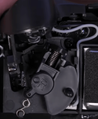 再來看看巧妙的力切換扳機,不上鎖的情況下就是一個霍爾扳機。當玩家按下鎖定鍵後,會通過一個類似卡扣的機械機構,按壓到下方的微動按鍵,還是挺巧妙的。