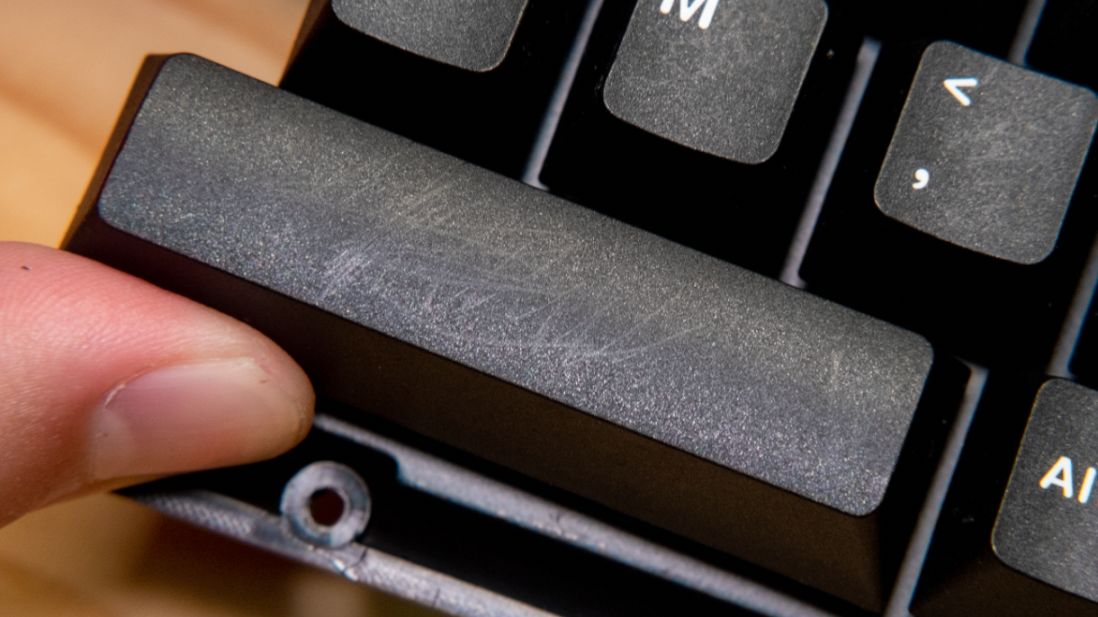 不過這套鍵帽因爲PBT含量太高,導致鍵帽表面的塗層並不耐刮,用指甲用力劃一劃就會像我這個空格一樣留下痕跡,這個大家在用的時候一定要小心。
