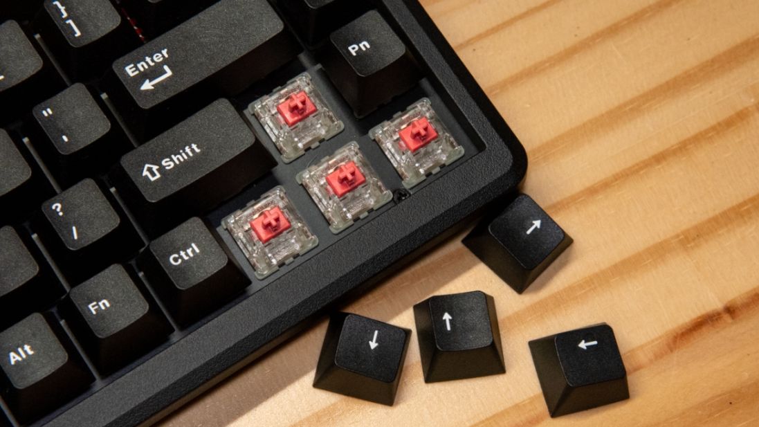 敲擊聲音要比紅軸小很多,可以成爲靜音紅軸,不過也因爲消音墊的原因,整把鍵盤包括大鍵的手感都比較肉,沒有原本紅軸那種直上直下的乾脆感。