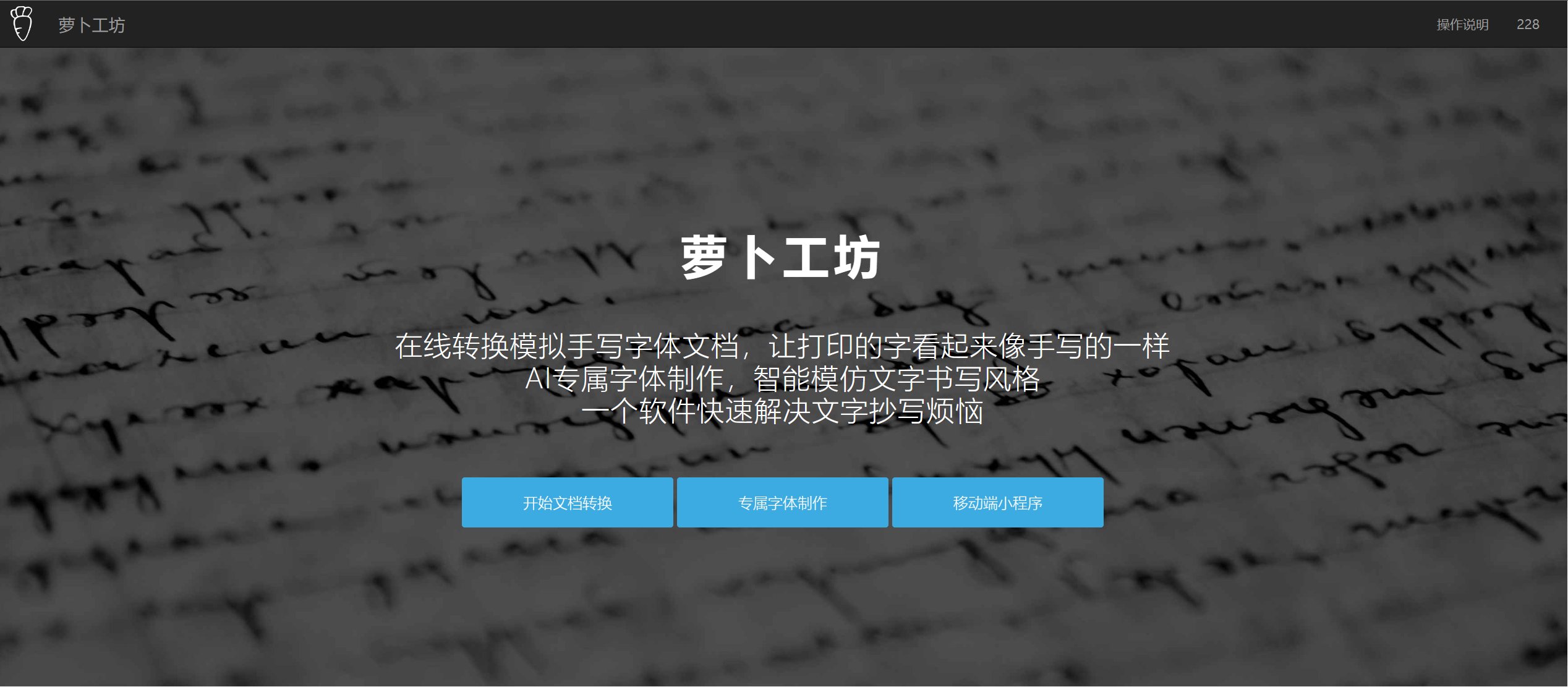 又比如蘿蔔工坊,快速轉換模擬手寫字體文檔,讓打印出的字看起來像手寫的。值得一提的是,還能通過上傳手寫文字照片,從而生成你的專屬字體。