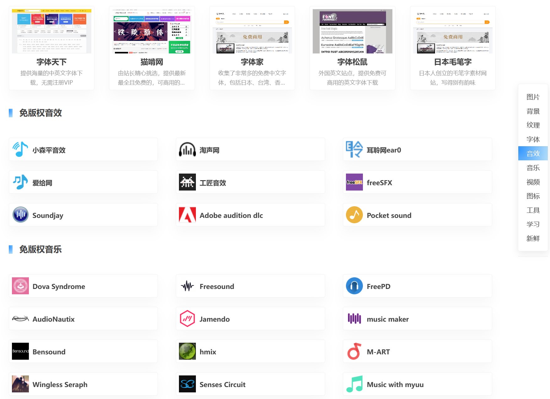 值得一提的是,在免版權音效板塊,收錄了小森平音效、淘聲網等衆多音效下載網站,例如Adobe官方提供的音效庫,包含了大量常用的音效素材,幾乎能滿足日常剪輯和製作視頻的全部需要。