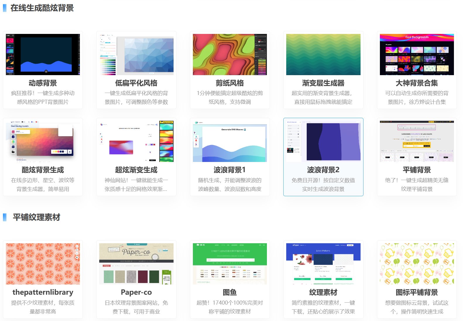 該網站界面乾淨清爽就不提了,重要的是彙集了許多無版權素材網站站點,包括圖片、背景、紋理、音效、音樂、插畫和視頻等,此外甚至還提供在線工具、學習資源和“新鮮~”的網站!