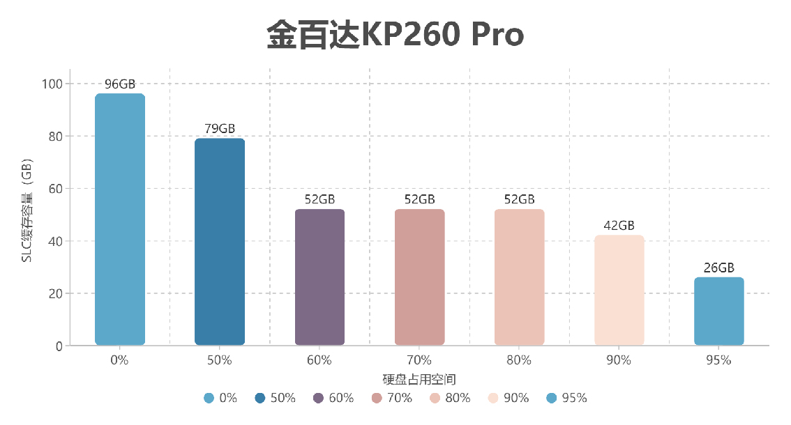 可見隨着硬盤使用容量越來越多,金百達KP260 Pro的SLC緩存空間也呈逐漸減少的趨勢,不過總體來看還是足夠我們使用的,大部分普通用戶在平時很少遇到這種大文件的寫入情景,基本可以認爲在絕大多數時間中,都能一直享受到這塊硬盤的SLC緩內高速寫入性能。