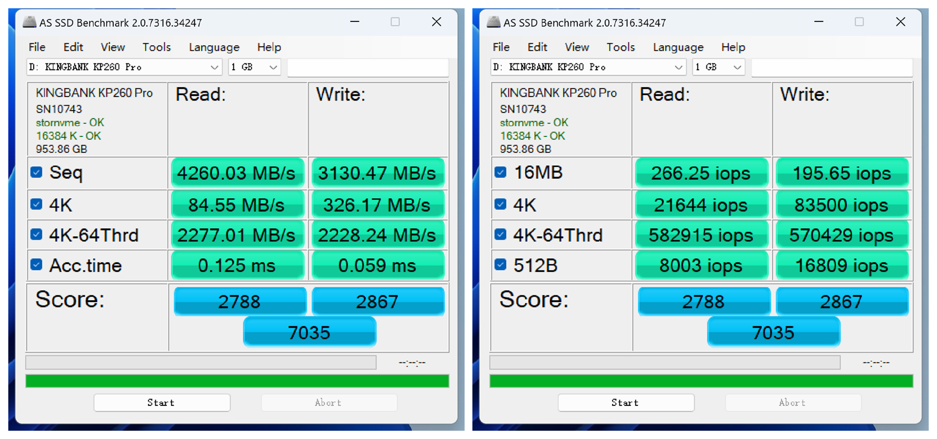 CrystalDiskMark默認顯示的是多次跑分的最高成績,AS SSD Benchmark與CrystalDiskMark使用的測試算法略有不同,以10進制測試並以2進制輸出結果,且顯示的是平均成績。所以正常情況下AS SSD Benchmark的測試結果無論如何都會比CrystalDiskMark低一些,不過由於AS SSD Benchmark有評分機制,對比起來比較直觀,所以還是很有參考價值。