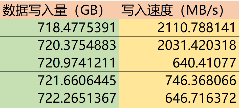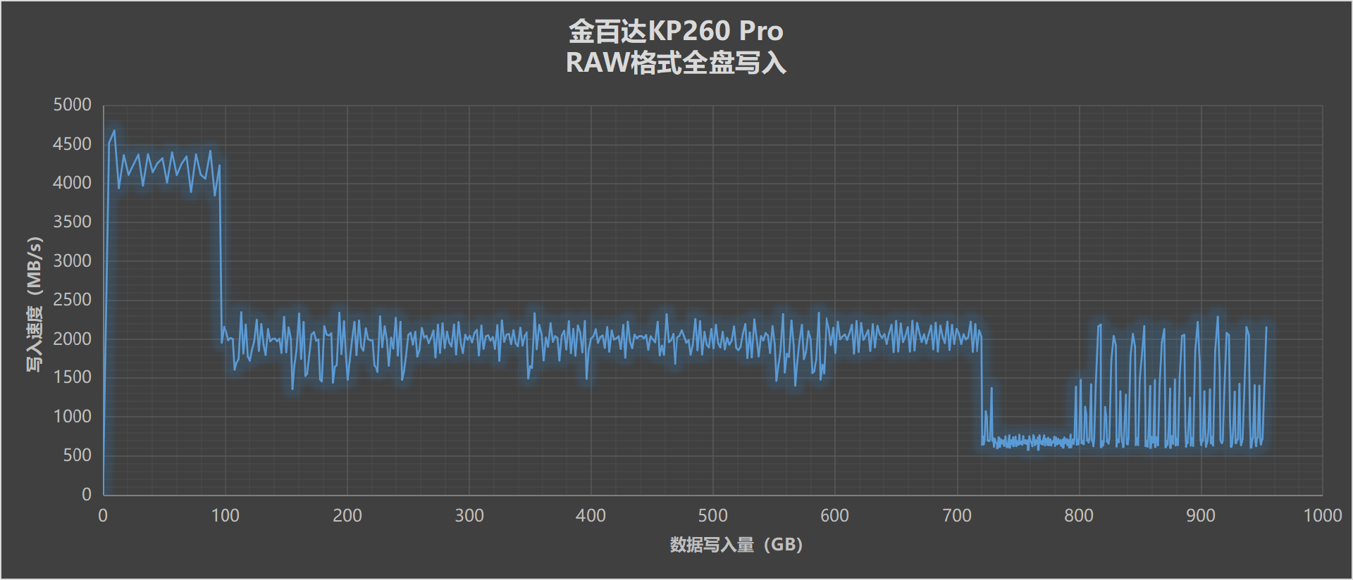 在寫入720G左右時,進入了最後一段最慢的垃圾回收階段。此時主控一邊忙着釋放先前寫入的SLC緩存空間,又要同時兼顧寫入,速度降下來是正常情況。在這一段曲線中,金百達KP260 Pro的寫入速度依然能維持在700MB/s左右,也是相當出色的成績了。