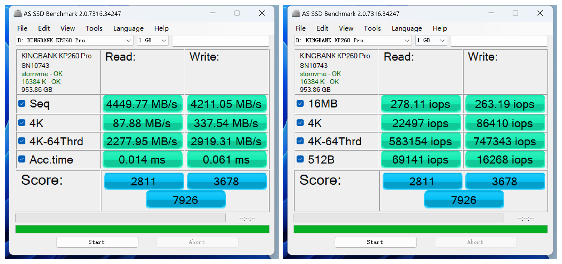 空盤狀態下,金百達KP260 Pro的順序讀取速度爲4450MB/S,順序寫入速度爲4211MB/s,得分7926分。同時緩內Q1T1 4K隨機讀取速度爲87.88MB/s,比CDM的測試結果還要好。