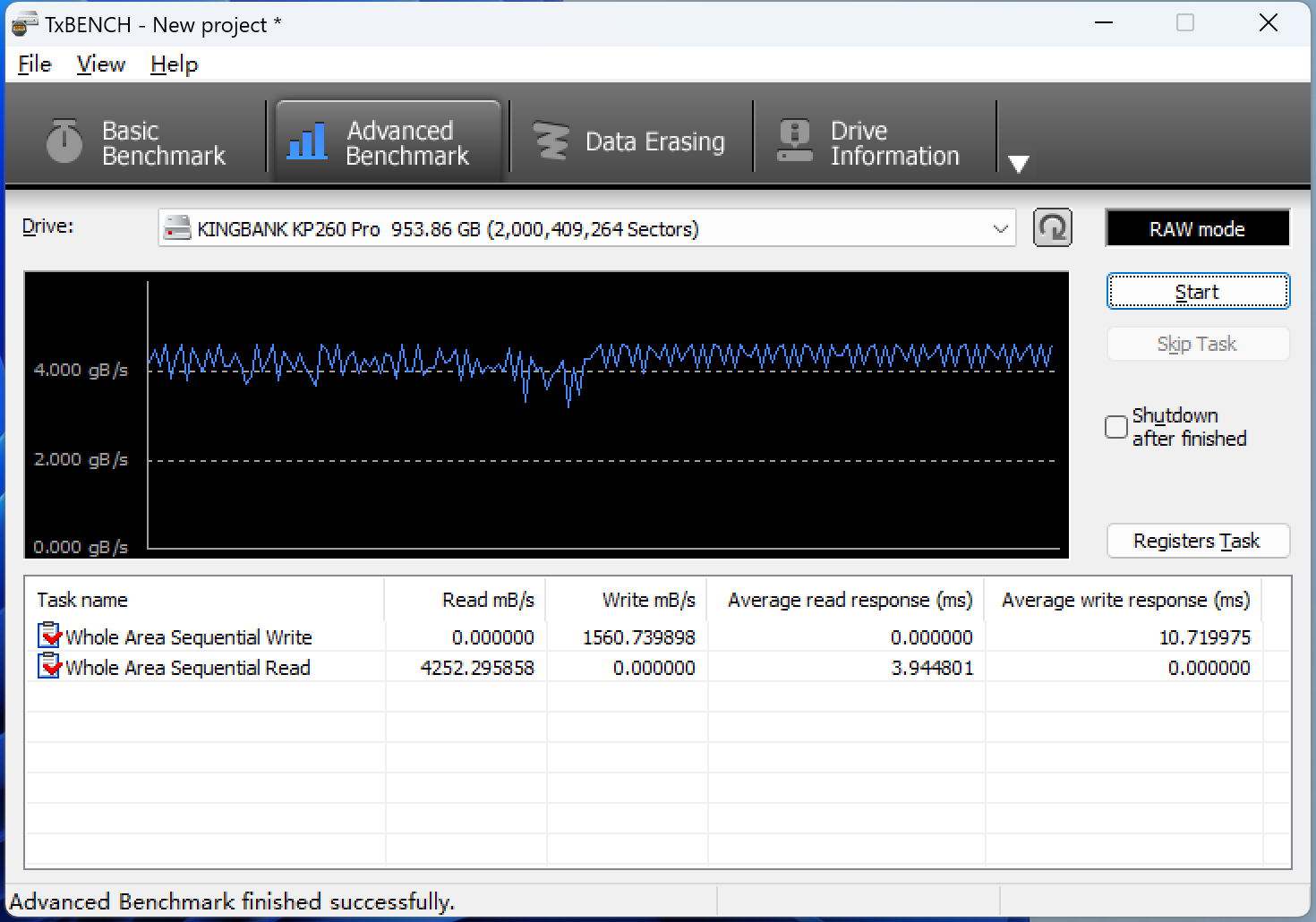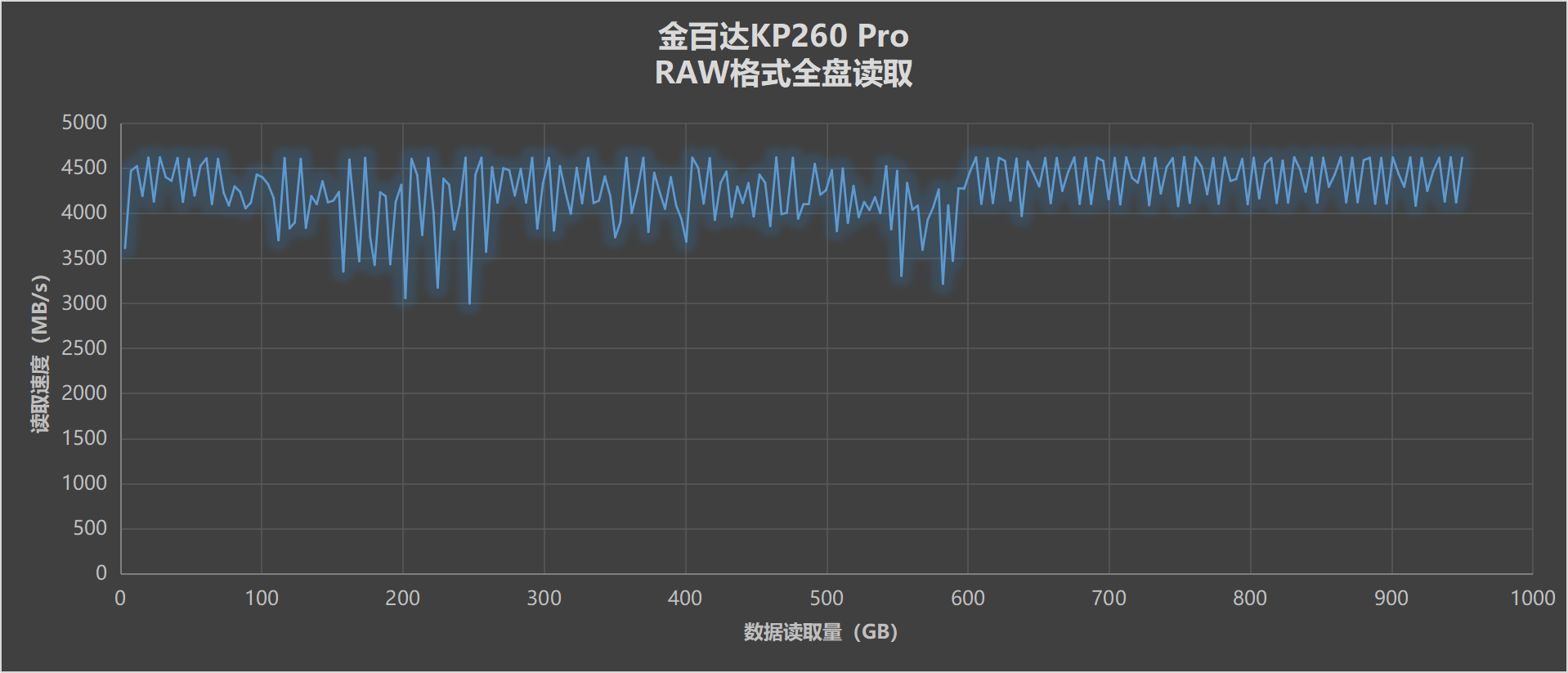 而金百達KP260 Pro的全盤RAW格式順序讀取的速度圖表如下,由於順序讀取速度不受SLC緩存的影響,所以基本可以全程維持在4000-4500MB/s以上的穩態: