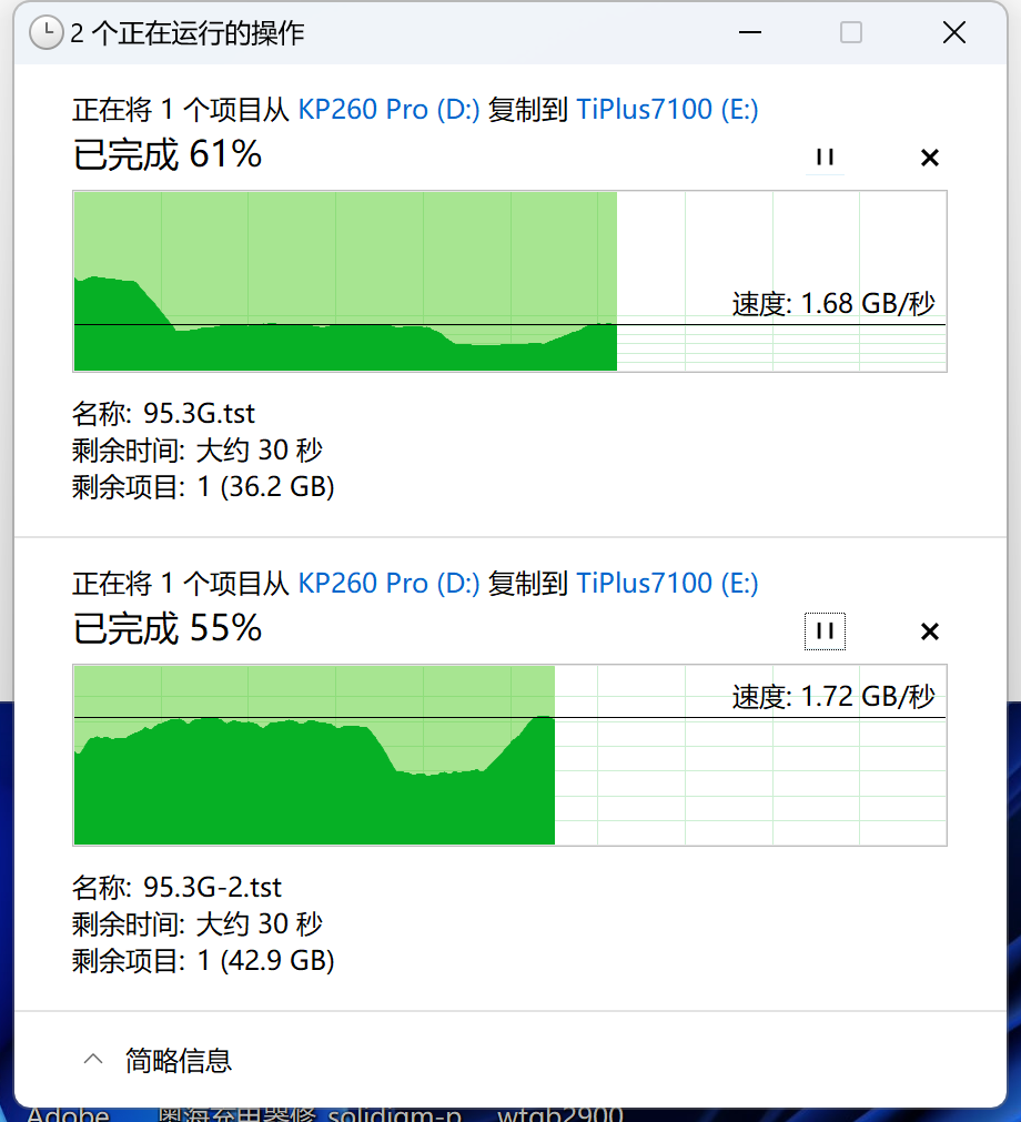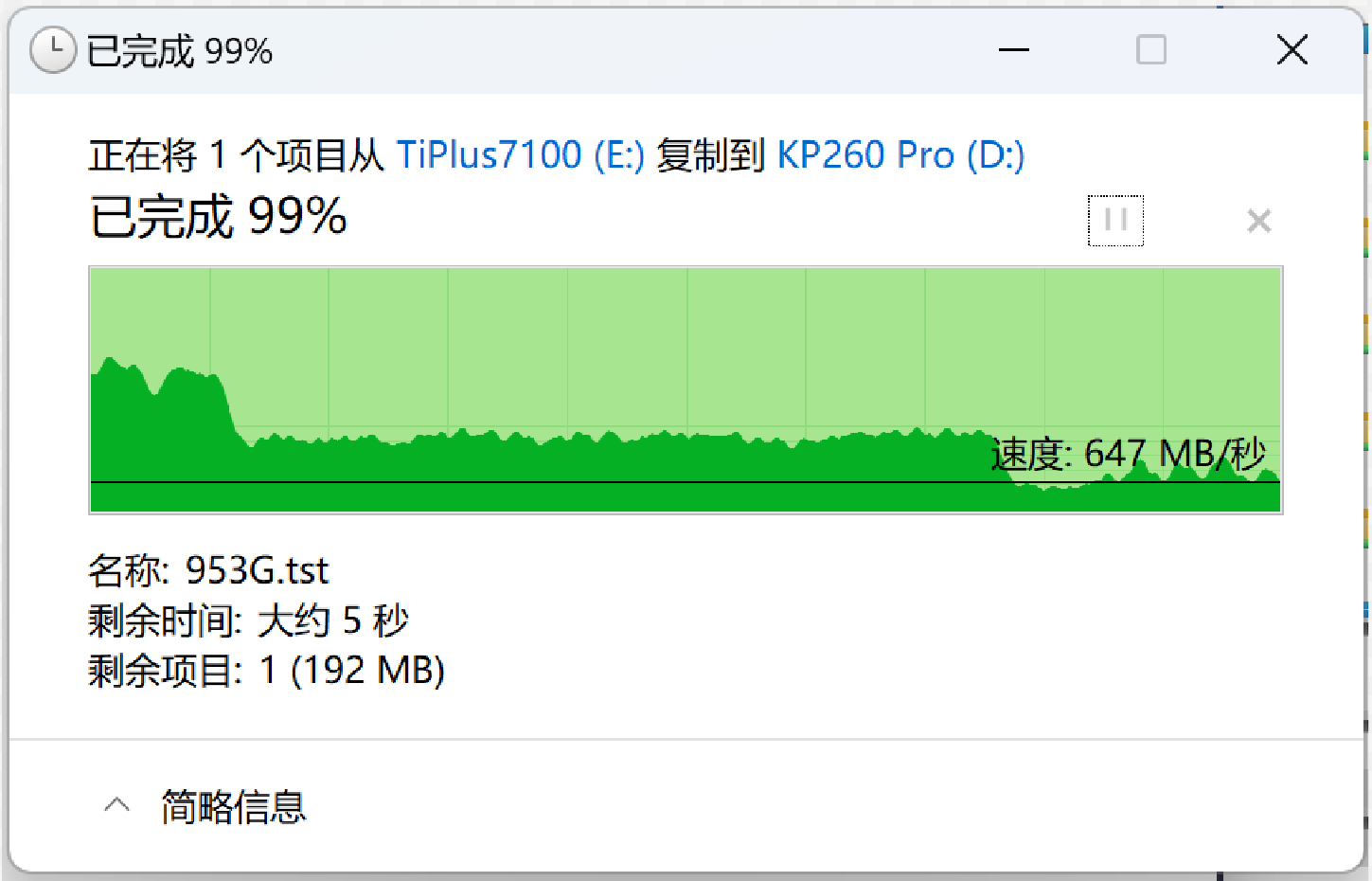 而從TiPlus7100中向KP260 Pro粘貼,KP260 Pro的寫入速度最多也只有3.7GB/s: