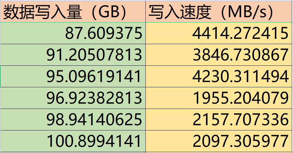 可以看得出來,空盤狀態下的SLC緩存爲96G左右,且在SLC緩存中的寫入速度維持在4000MB/s-4500MB/s之間。