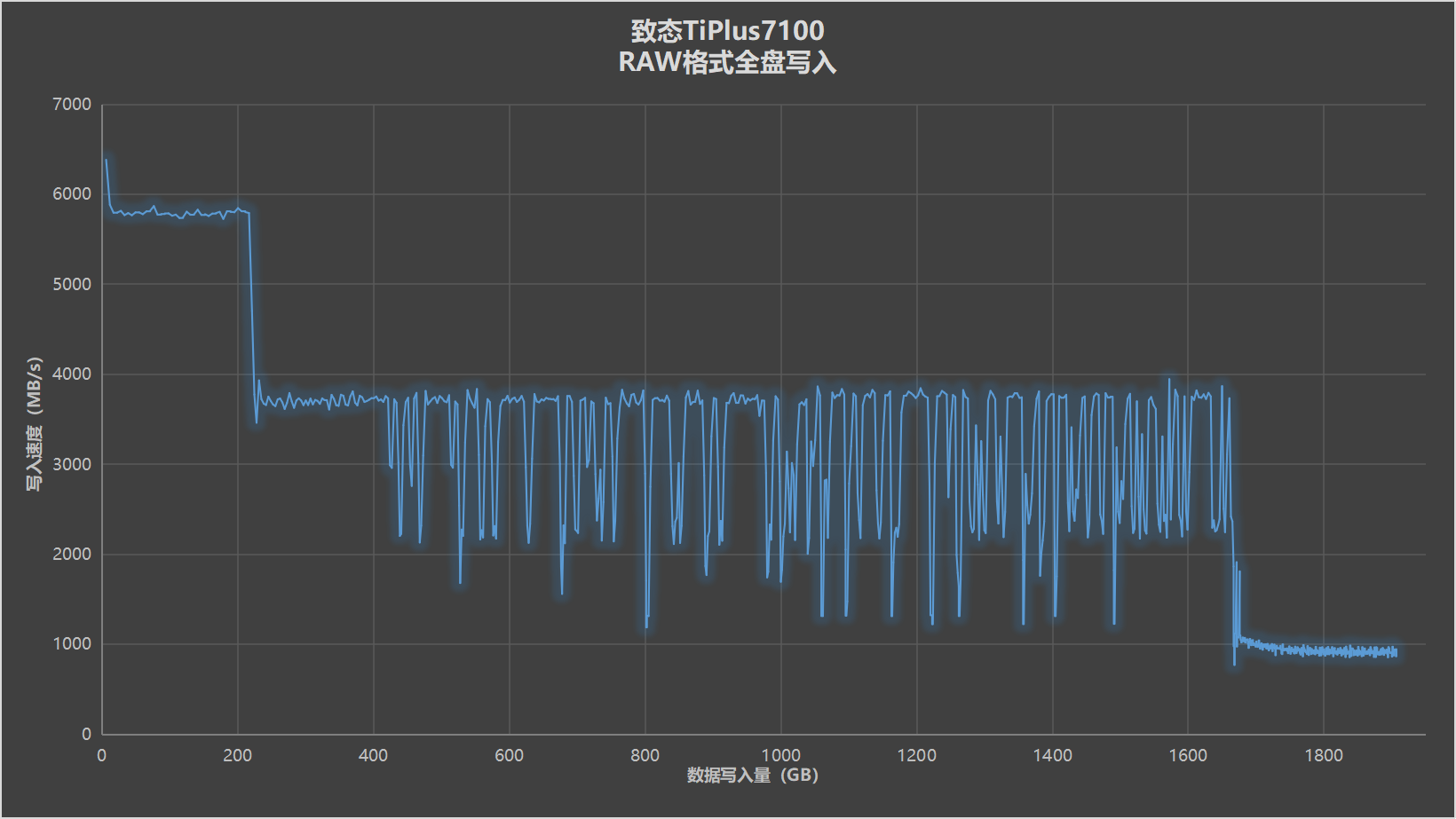 在出緩後的第二段TLC直寫階段,寫入速度維持在2000MB/s左右震盪,期間雖有小的波動,但是這個直寫速度還是相當棒的。